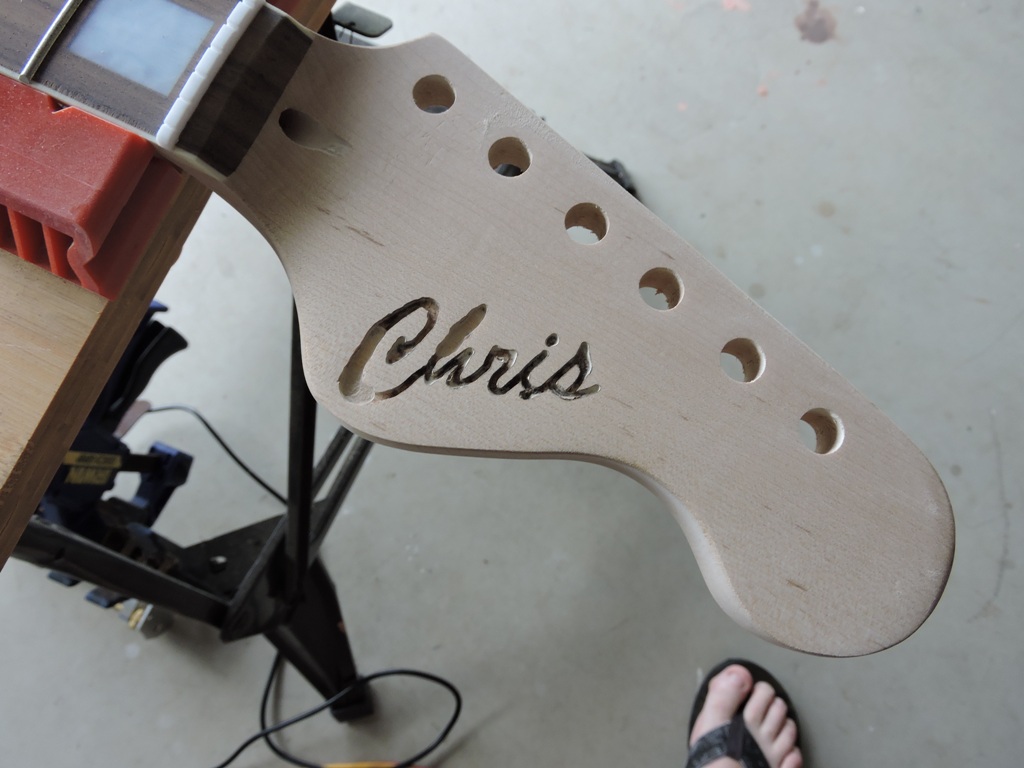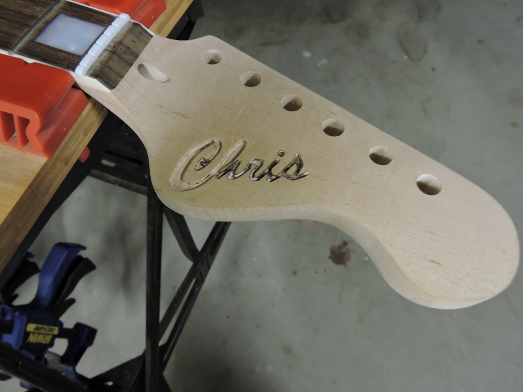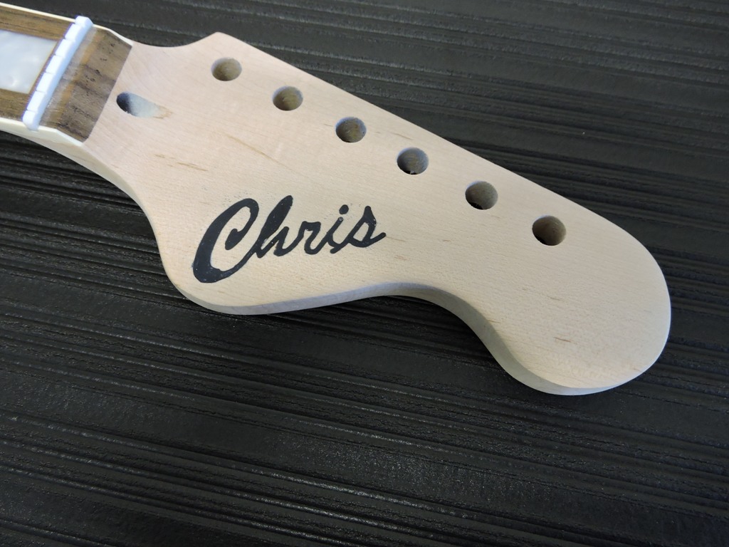 Sanded back the headstock after applying the epoxy and letting dry for several weeks. Not entirely happy with the result as looks pretty rough. May look at putting on a veneer to cover it. But lesson learnt -You'll never know unless you have a go I suppose. Have ordered some proper inlay routing bits for the Ozito, for the next guitar.
