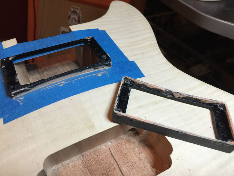 This particular kit has a very high arch and the humbucker mounting rings didn't just need scribing, I had to add to them as there were large gaps between the mount's corners and the guitar top. Too much to ignore.