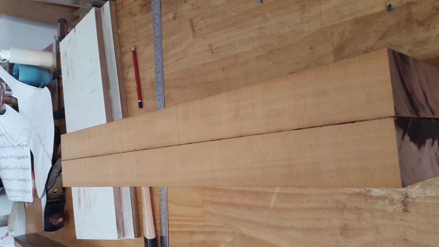 Unfortunately, it's not going to be the "one-piece" dream. Not quite. The long story-short is that it would be less stable in the middle of the guitar, and be at risk of splitting and etc down the line, so for stability's sake, we're splitting it down the middle, and flipping the pieces around. And as you can see, it's much nicer on the inside!