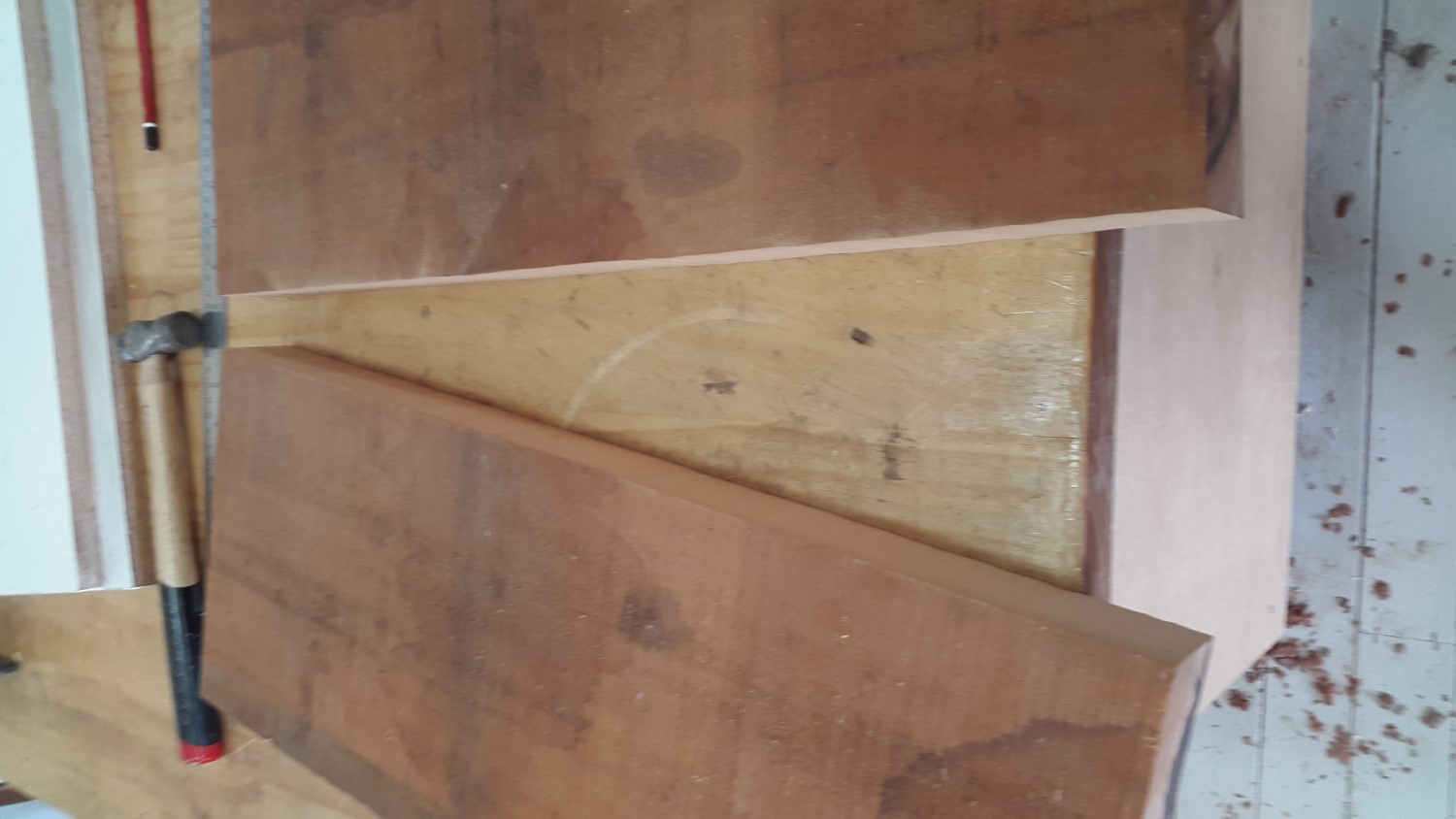So I got my piece of Jarrah today for the top. There was 3 bookmatched pairs to choose from, and well it basically came down to "which looks more figured" so yeah... It was actually fairly easy to catch this figuring on camera, I expected it to show a little less, because while it's definitely there, it's not amazingly striking right now, but of course it will come out much more after it's been worked with.
