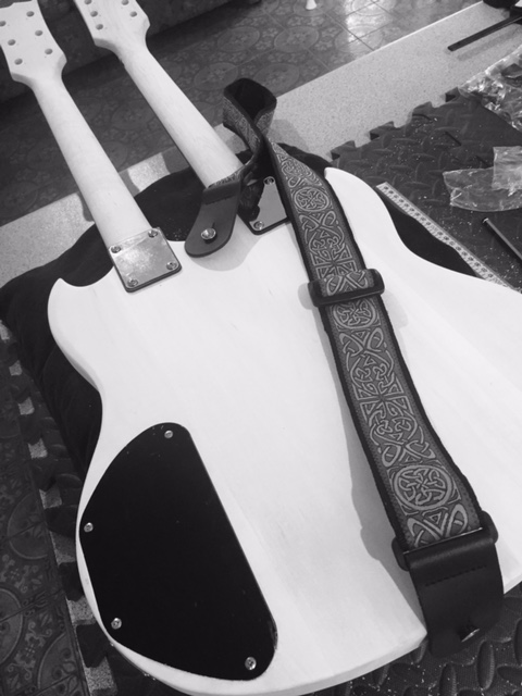 Bolt on neck drilled and attached, straps locks fitted and checked. Note: the neck strap lock on the gibson and Epiphone is usually located behind the necks which cant be done with the PBG kits as the bolt on plate is there - so it needs to be placed between the two necks (carefully so that you don't drill through to the control cavity.
