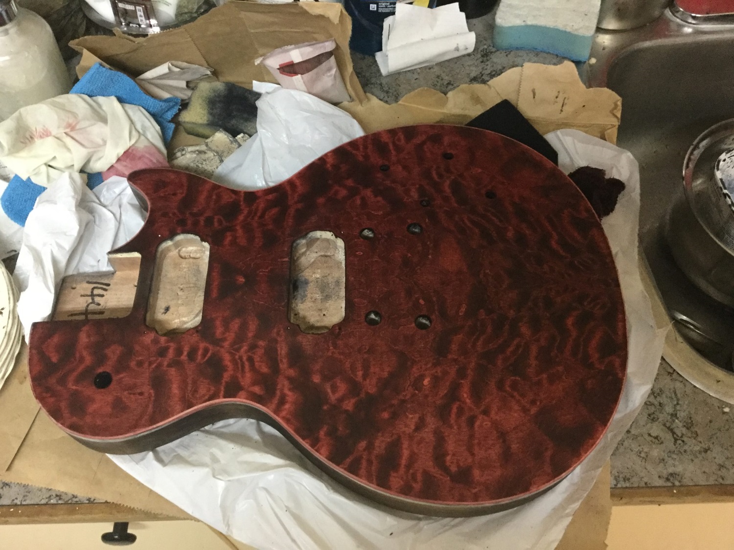 Wow! that red dye really brought it up huh? Looking fantastic man, what are your plans for pickups are you going with the kit or are you going to change up?