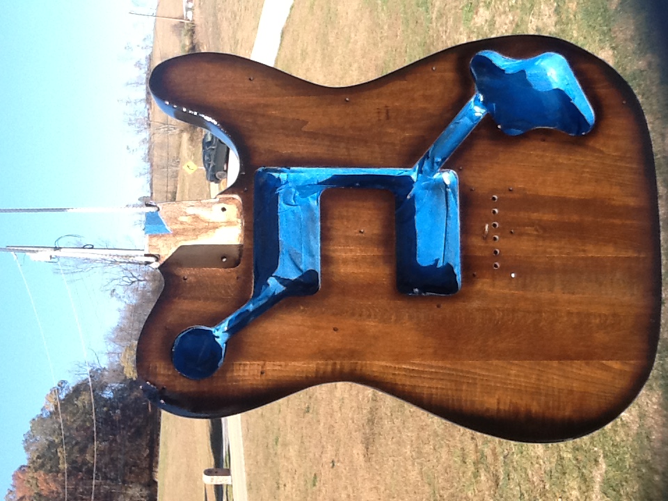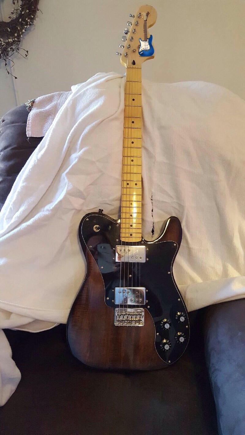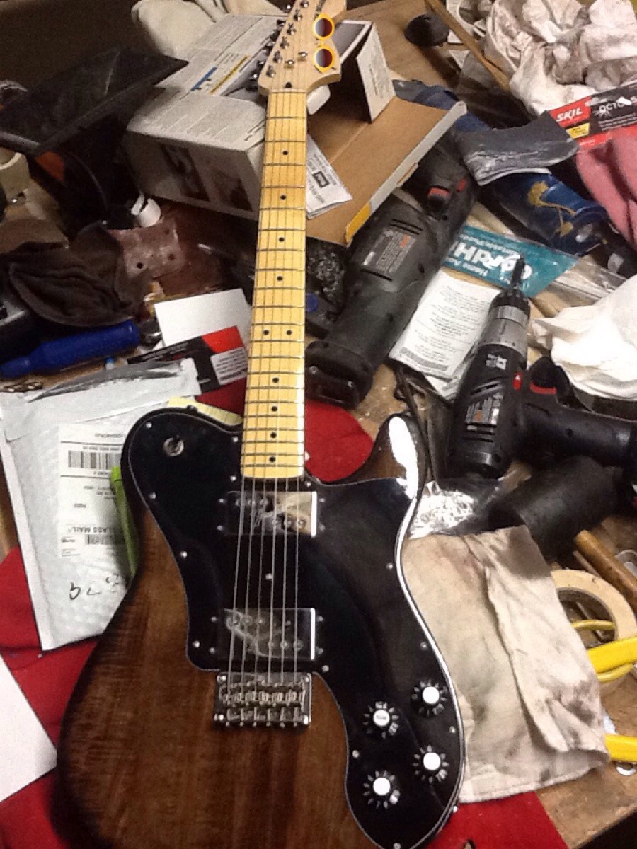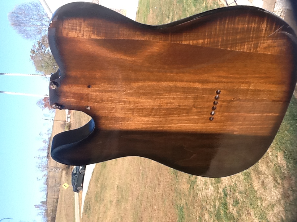 Well, I had hoped this would be a Pitbull Build, but the Tele Deluxe Kit was back ordered when I had the means to purchase it, so I kind of had to order what I could. I ended up getting a kit from a company here, in the US called Seismic Audio. They mainly deal in sound equipment, but they had a few kits as well. They only sold this kit in basswood, which I was worried about, because I wanted to go,with a natural walnut finish, but I worked hard on it, busted my butt, and I think it came out GREAT. My friends have told me that if they hadn't witnessed the stages of the build, they would have thought I was lying about building it. I had some Fender wide range humbuckers lying around, so I added those, upgraded the tuners,and put on some black strap locks. I apologize that the only shot of the back that I have is from when It was hanging outside while the clearcoat was dryingThis is my first, of what I figure will be many builds.