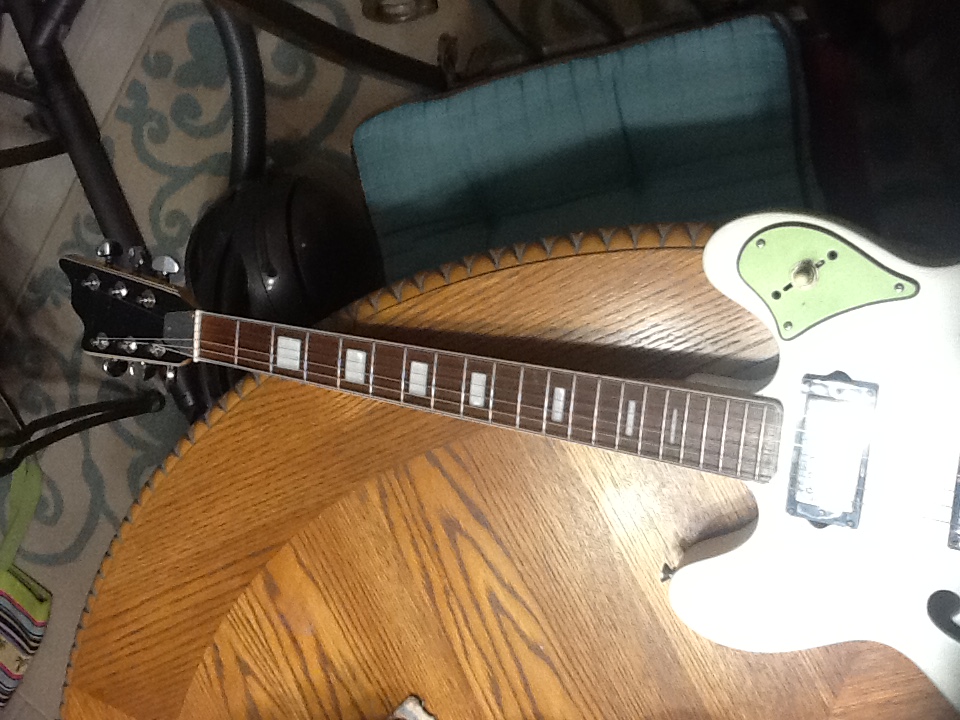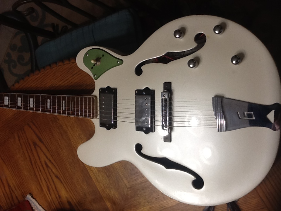 Well, as I read through all of the rules for this little competition, I realized I had another eligible entry. This is my 1968 Univox Custom. I've always had a thing for 60's and 70's Japanese Guitars, and I found this treasure on EBay in approximately 2003. I think I paid about 70 bucks for it. It had no-name Zebra humbuckers in it, the original Tremelo Tailpiece was gone, and it had been painted bright yellow with a brush and latex exterior house paint. I was kind of disgusted when I removed the latex paint, and found a beautiful, yet mostly sanded off sunburst finish. However, since that finish was cooked, I went to a local auto paint supplier and had them mix me up a nice pearl white. I rewired the guts, and stuck in a couple of pickups out of a late nineties Epiphone Les Paul, and a Grestch tailpiece I had lying around. I also replaced the 3 way blade switch (like what you would find in a telecaster) with a 3 way toggle out of the same Les Paul that the pickups had come out of. The univox head badge was long gone when I got the guitar, and I'm always keeping my eyes open for a replacement. I think the guitar came out really well, but the back is dented as if it had been in a hailstorm! I was in my early twenties when I took on this project, and using wood filler or body filler to smooth the back never even crossed my mind. Hindsight is always 20/20 as they say. I included a photo of what the guitar would have looked like new. Being an older refurb,math at I don't have a case for, it has taken on a few dings over the years when moving, etc.