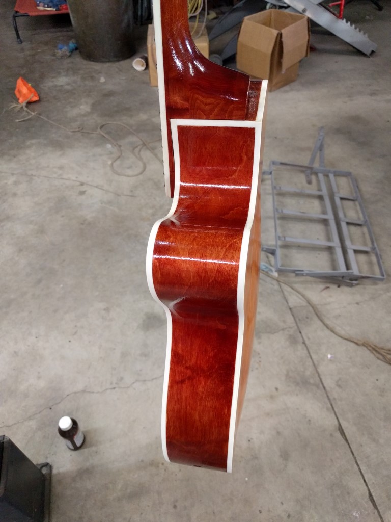 After the fourth coat of Tru Oil I cleaned up the binding with some 0000 steel wool and went over the wood with 00 steel wool lightly, as recommended on the TO bottle. No surprises. I applied a fifth coat of TO, let it dry, cleaned the binding, and applied a sixth coat.