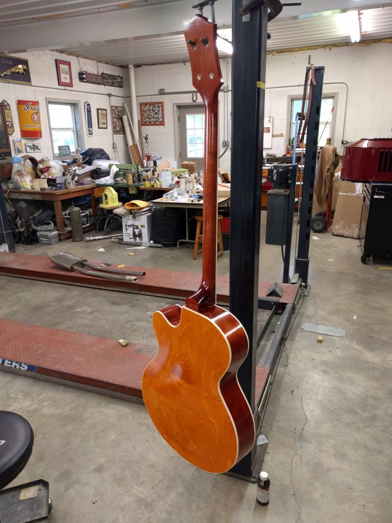 We can't take credit for the idea of the suspension jig. I saw someone else's build thread where they were finishing the body of their guitar and had it suspended via what looked like a clothes hanger through a pot hole in the face. We figured, why not do that with the whole guitar? I didn't have any input into the hanger design, though. That was entirely my old man's work. And I think he did a good job. The cotter pin in the top is a VERY good idea.