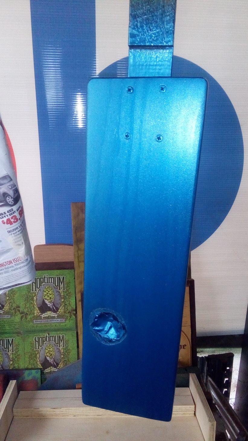 here's pics after first colour coat, haven't decided on the final shade of blue but will wet sand and get another coat on today. Headstock needs sanding back was the end of a can of a darker blue and wasn't spraying too well.