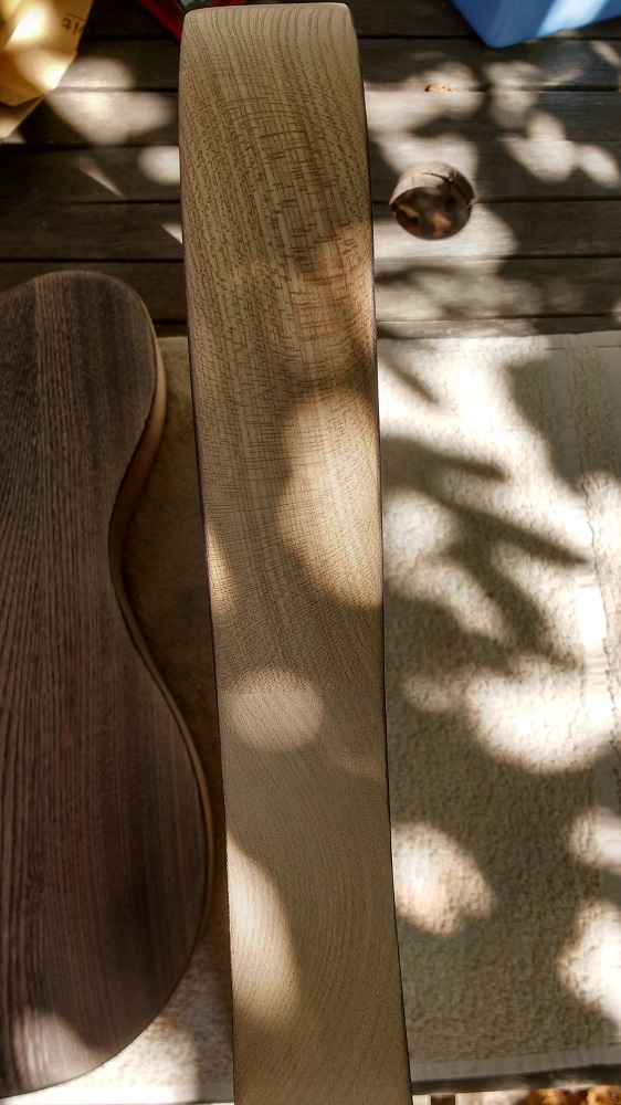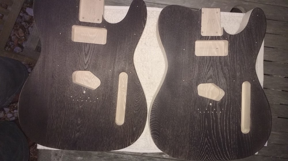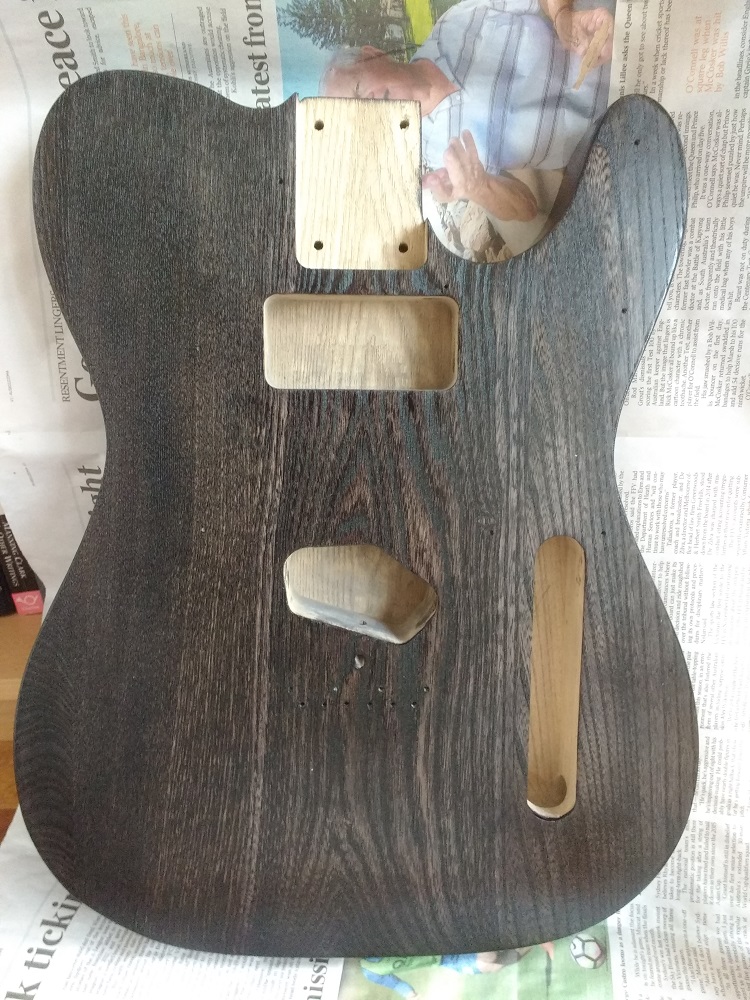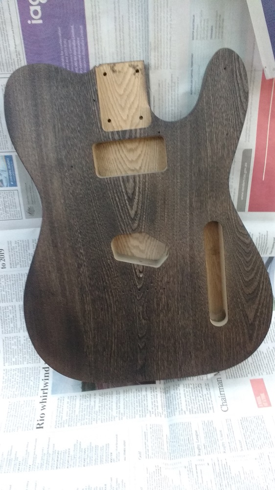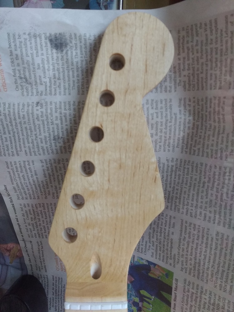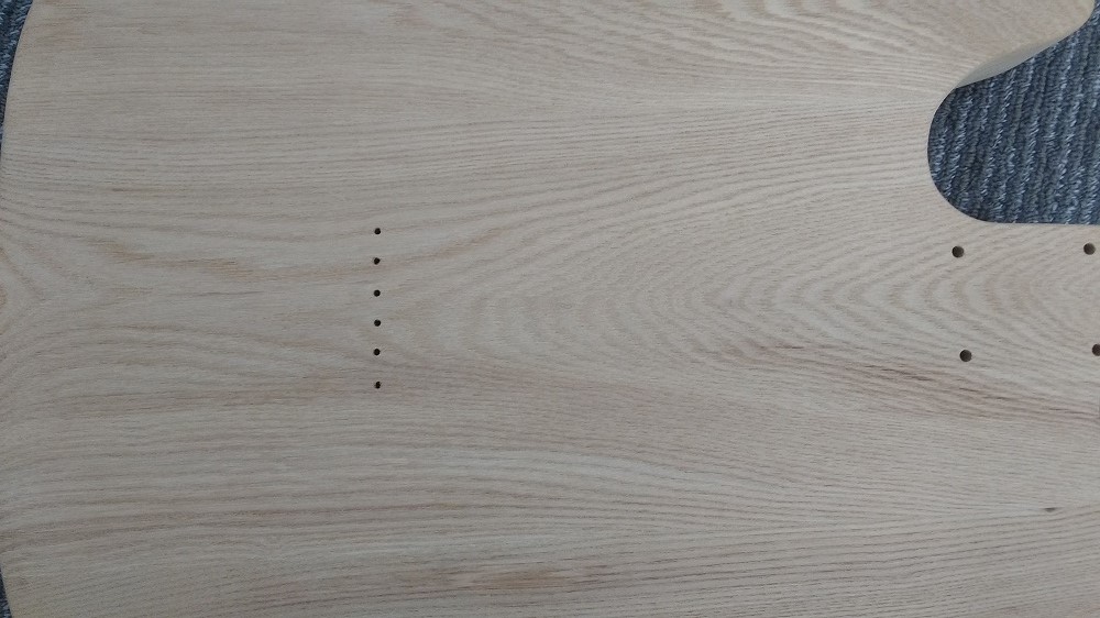 Additionally, one very useful tip I picked up doing this that will probably of use to others: when drilling your string through holes, in order to get the the best possible alignment on both sides, drill only the outside two holes all the way through from the top; drill the others only half way through. Then flip the guitar over, and using your outside holes as markers, align the centres of the other holes on the back, then drill these from the back to the mid point. In this way, if there is any deviation of the drill from vertical, it will not be apparent from the faces, and there should still be plenty of clear passage where the holes meet to allow the string to pass through. Given the short length of 2.5/3 mm drill bits, this also makes it easier to drill than trying to get sufficient working length of bit outside of the chuck.