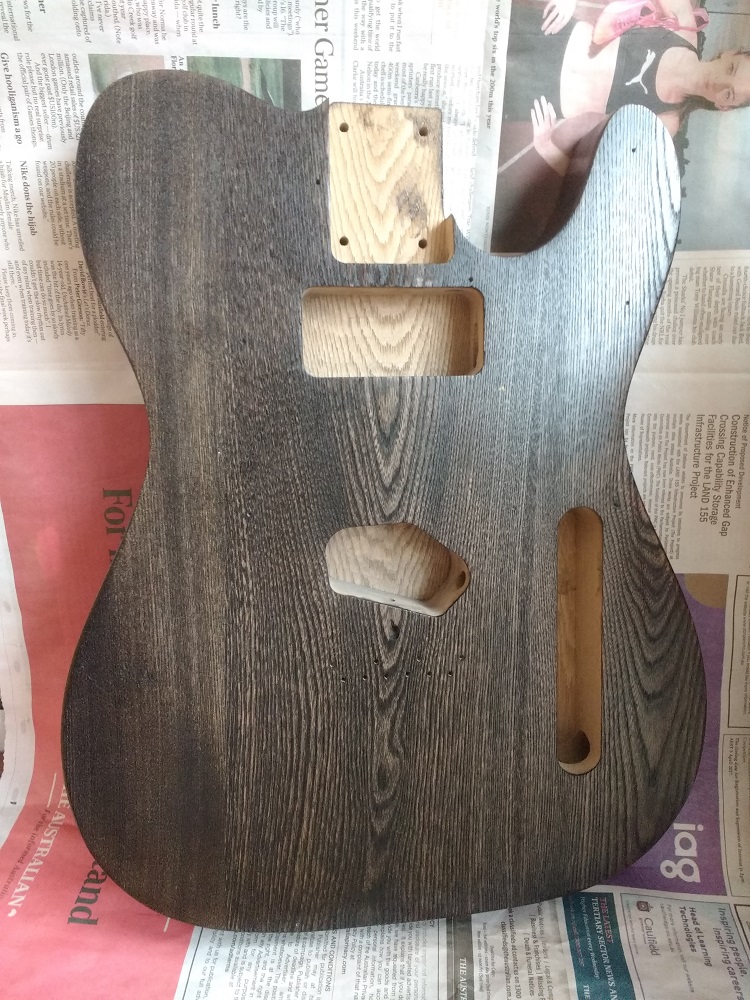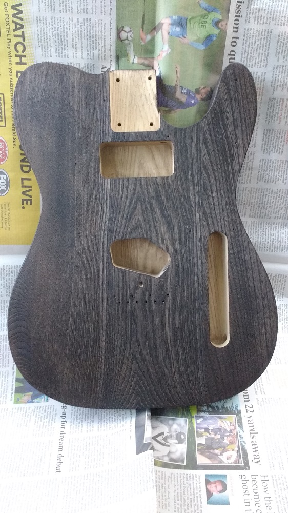 With these holes now drilled, I can make a start on sanding and first stage of finishing. In order to give greater depth of colour to the grain, I'm going to apply a very dark black stain first, then sand this back to reveal the natural wood again, while hopefully leaving a darker grain line, then set to work with the DingoTone Black Stump. Perfectly timed to coincide with the long weekend.