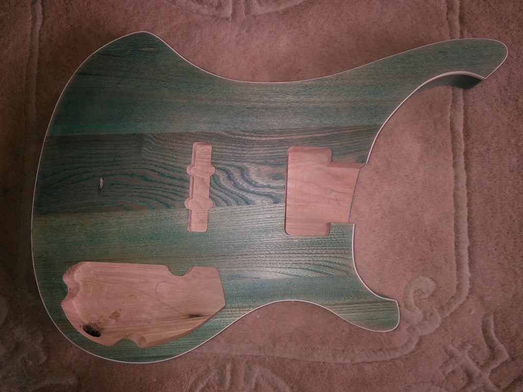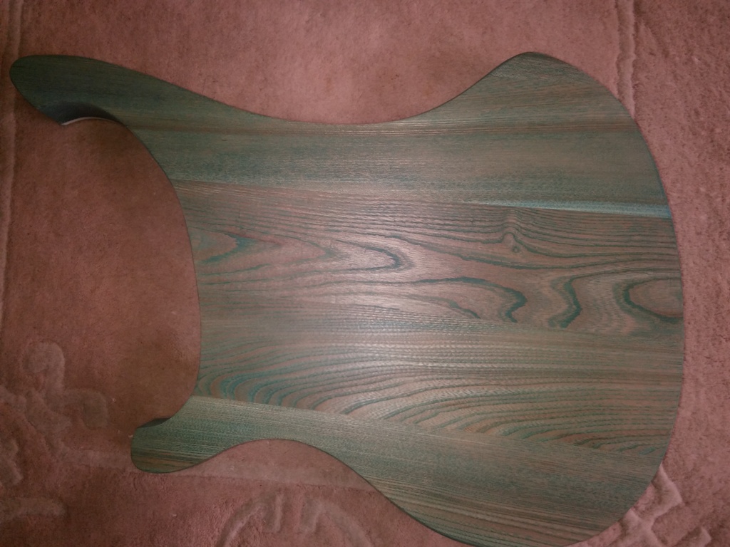 Finished sanding now, gone down to 320 grit, which looks pretty much OK. First coat of stain now done (Azure Lagoon from Wudtone), looks a bit green to me, but according to their spec it becomes blue the more coats you give it - let's hope so. Will be applying 3 or 4 base coats, then there is a deep colour coat, then a top coat. So I guess about another 8 or 9 coats to go.