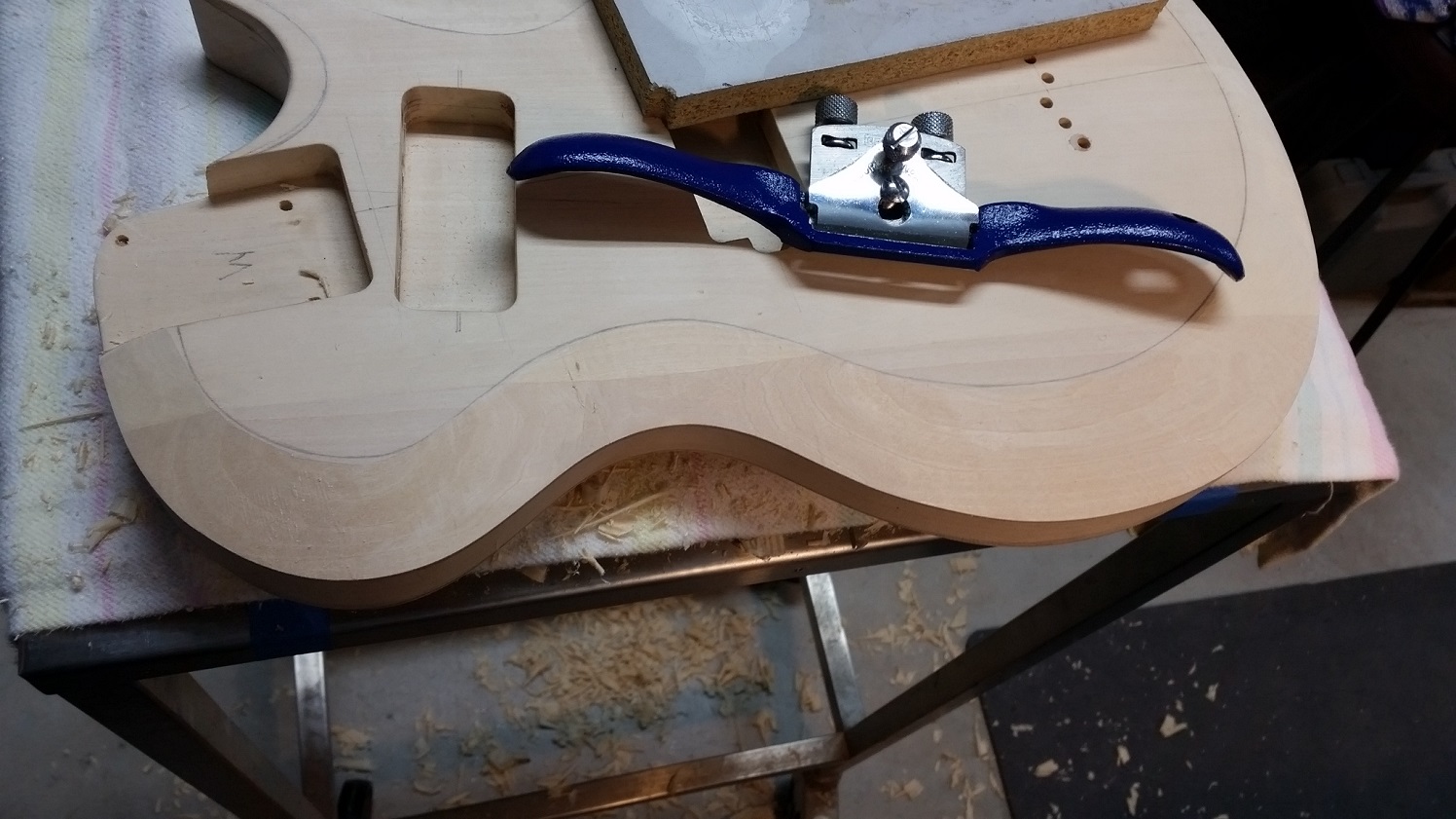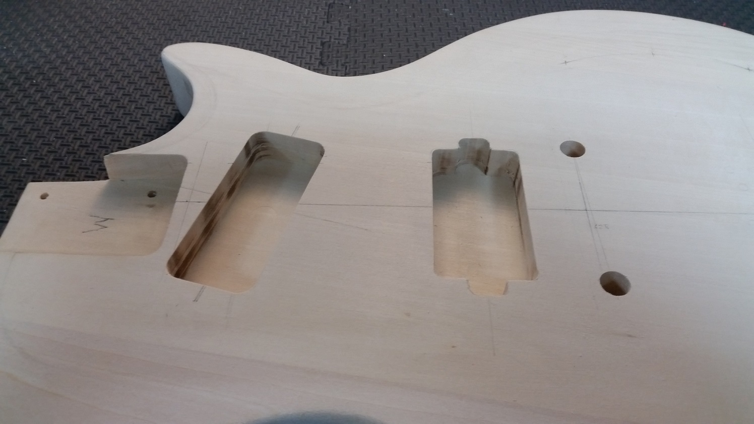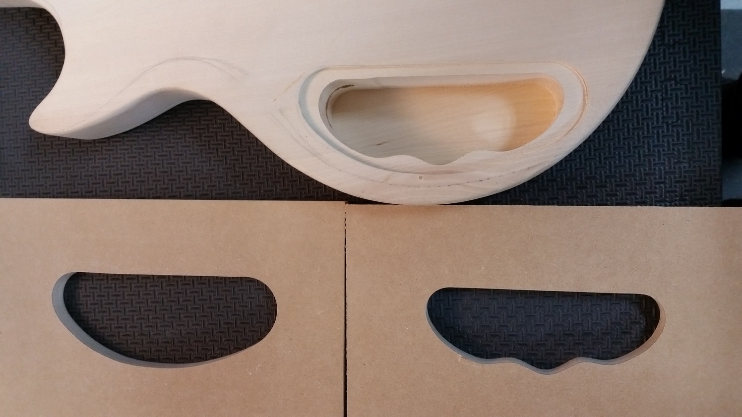 Stan, had the same thought about the control cavity and sketched out a shape that should work. After my mishap with the drill, wasn't going to try to freehand the rout, so made a couple of templates. Tried to line them up as close as possible to the cavity wall but both ended up a little off on the straight edge.