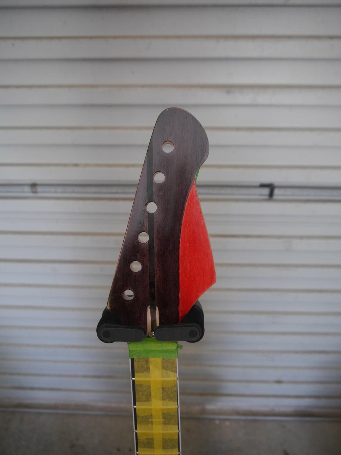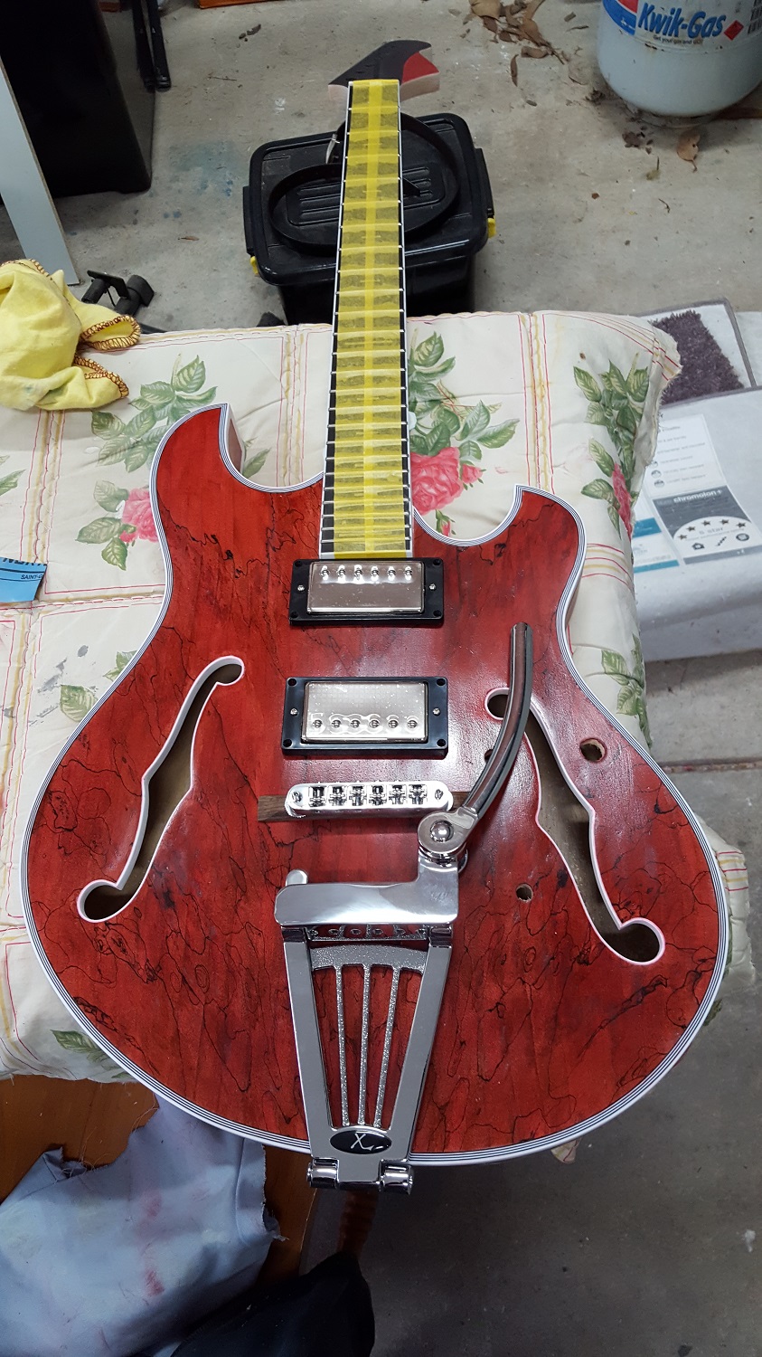 The original design has a floating bridge with a rosewood tailpiece but I've decided to go with a Bigsby style trem. And yes, the offset body will mean I will have to work something out to keep the trem straight. More on that later.