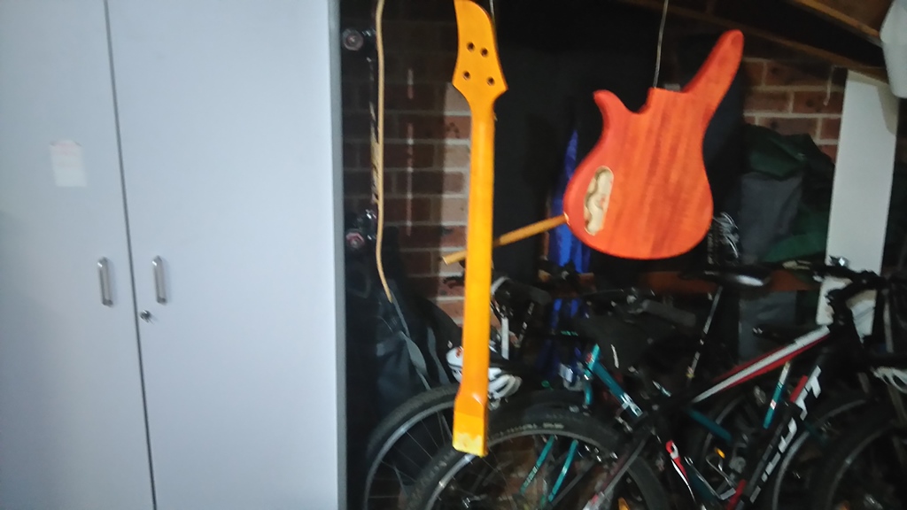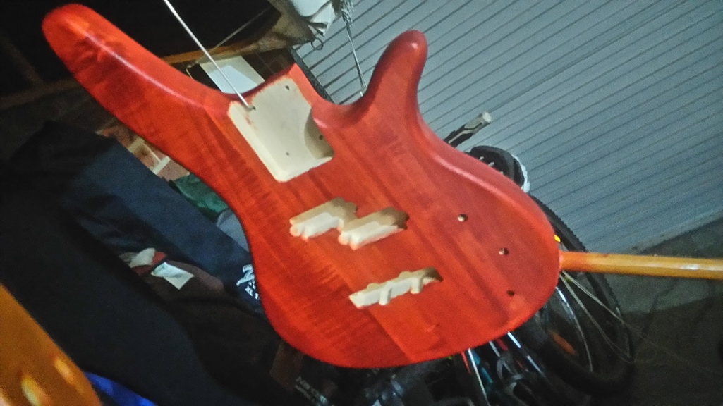 So did another coat of bushfire sunrise on the body and a cot of 5:1 mission beach to bush-fire on the neck. i think it's looking pretty much exactly like what i had picture (maybe a bit deeper on the body but this will be accomplished by the intensifying coat).