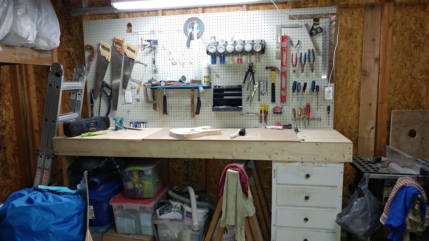 Keep in mind, I'm no carpenter. This is a pretty simple bench. I do plan on installing a vice somehow to hold the neck and body while I work. The drawers were re-purposed from an old kitchen cabinet, and I already had the peg board. I've installed 2 new outlets on either side of the bench, and the work light above.