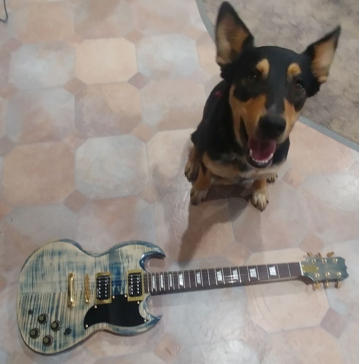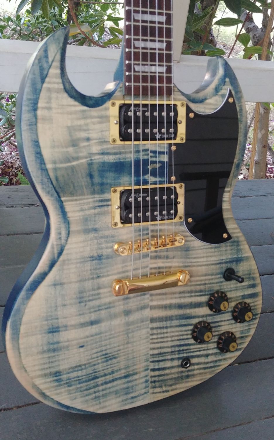 It is an SG-1F, I have installed Entwhistle Darkstar pickups which are crazy hot, a bone nut, Rotosound 59-11 strings (tuned to C standard), it has push/pull pots for coil splitting and shiny gold bits.