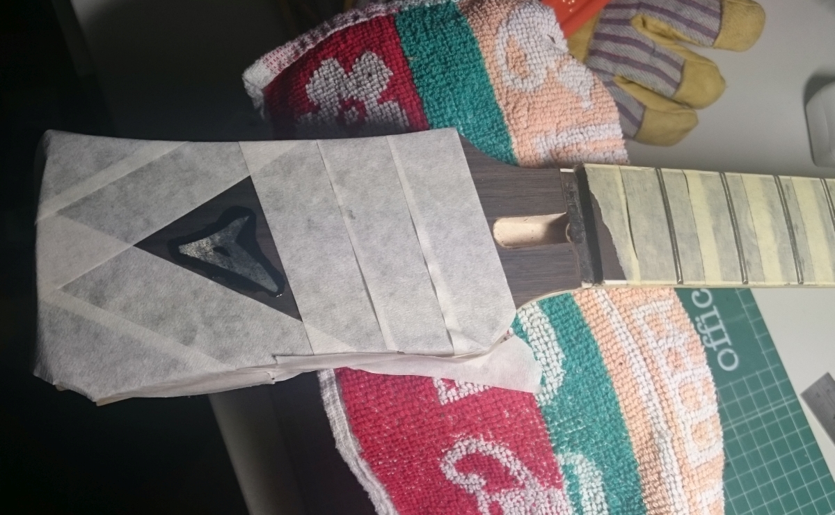 I made an "A" inlay out of a mother of pearl piece. It is now fin place and waiting for the epoxi to dry. Let's see how it looks after drying and sanding. I plan to sand and round all headstock edges after this.
