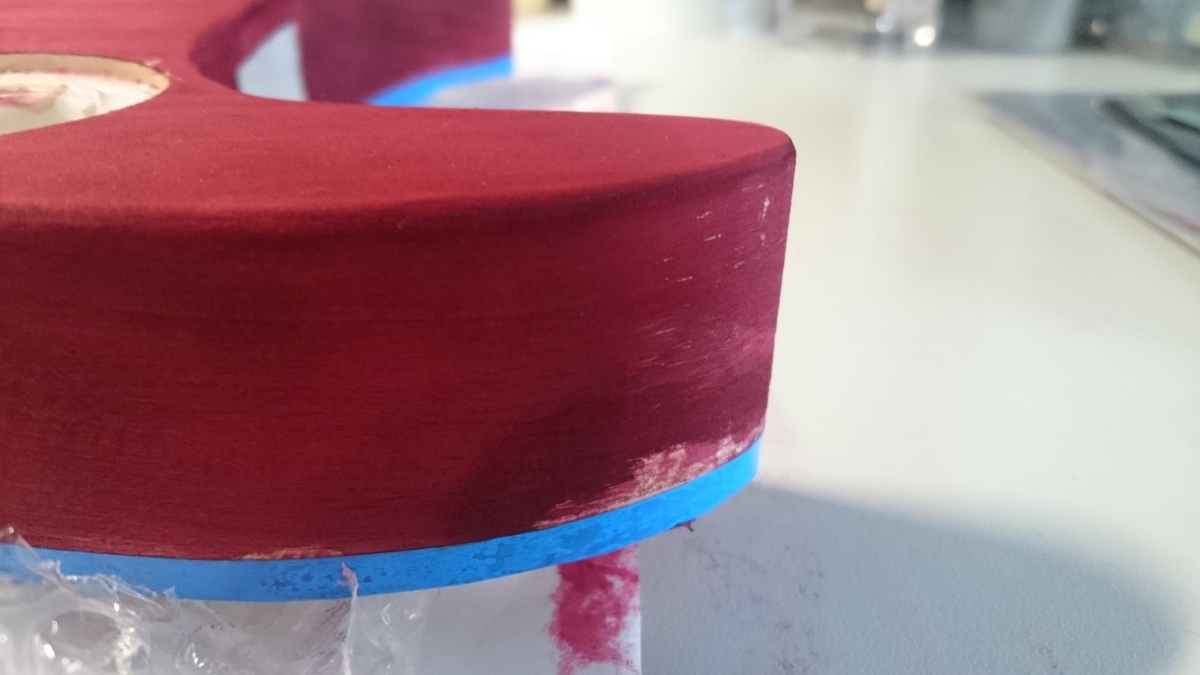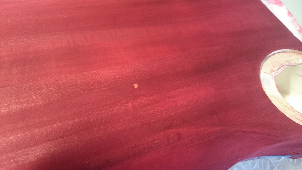 I'm using a water based wood stain. It's a mix of red with a bit black and yellow because I want to reach some dark-brownish red for the back of the guitar.