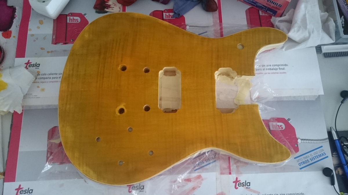 The top was much worse, especially near the edges, close to the binding: a lot of glue spots not taking any stain. I used the same techniques and finally it looked good. I wanted to try a cherry sunburst, so I started with a little black to pop out the flamed maple. My black is a bit blue, so I made a mess: after the yellow, it came up green... Then I started to make trials with yellow plus some red drops to have an amber colour, then it turned into something less disgusting, coat after coat. I sanded very very lightly, because I was afraid to sand through the veneer. So finally after the red (1/2 yellow - 1/2 red, because my red is a magenta) in the edges this I found my cherry sunburst kinda finish. Not perfect, but OK for me!