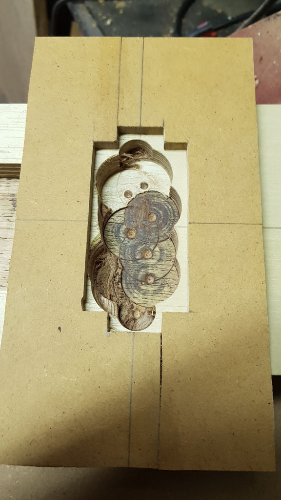 Feeling buoyed by the success of my neck pocket, I wasted no time in attacking the humbucker routs, firstly with a Forstner bit on the drill press, and then with my template bit.