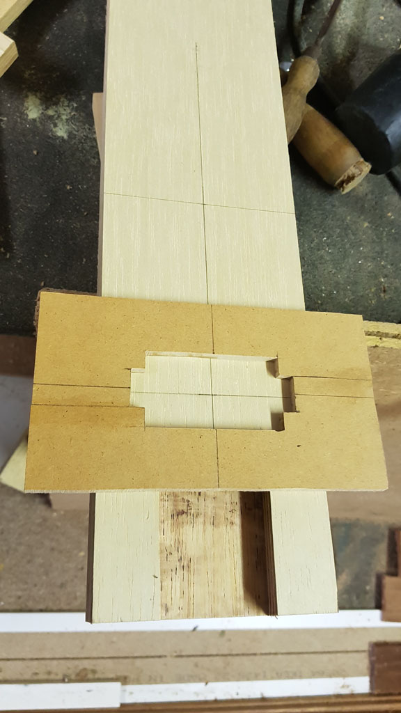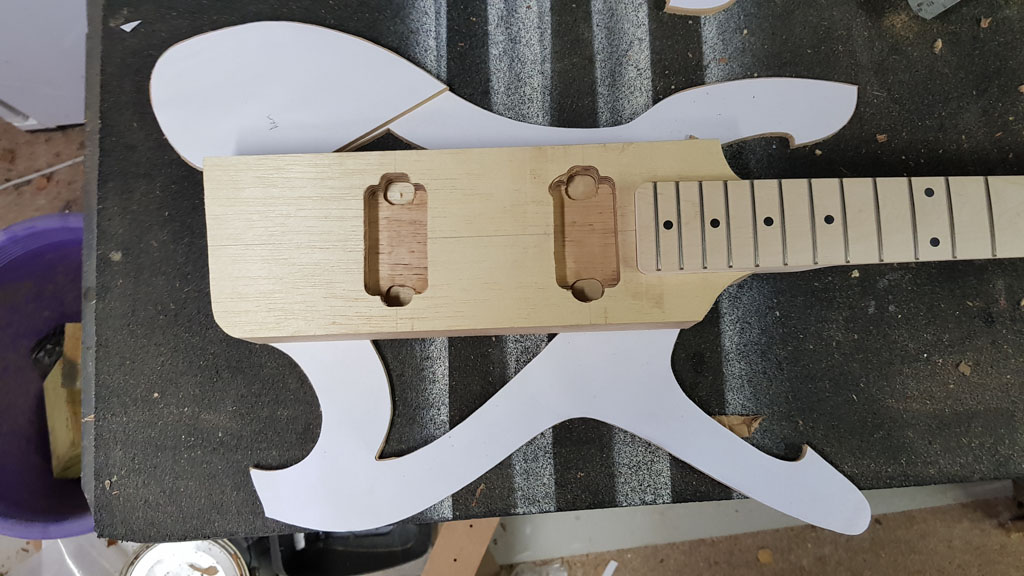 And as luck would have it, even more progress today. With the glue set on my humbucker template, I measured and drew centre lines and went crazy with double sided tape.