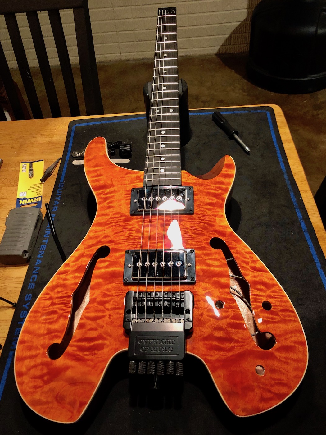 Okay! The hardware is in. That said, the "Overlord of Music" bridge (who the hell came up with that?!) had its tuner's teflon spacers crack and fall out upon first string intall, rendering it nearly unusable. Without those spacers, the tuning pegs are impossible to fine tune, even with a screwdriver.