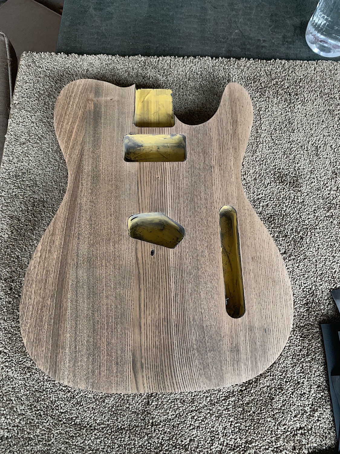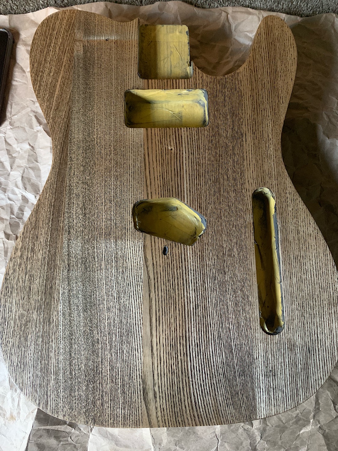 Have been busy with sanding the guitar body in prep for grain filling. And have just filled with ebony timber mate. I am relatively happy with how this has turned out as I wanted something to pop the grain of the wood.