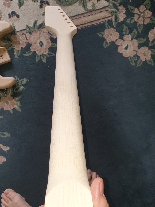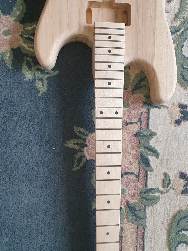 Anyway. The neck and body fit really well. The body is definitely two piece. The neck appears to be maple...not so much flame maple. I found one line of possible flame on the fretboard at the ninth fret. Nothing on the headstock nor the back of the neck at all.
