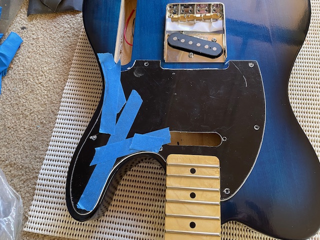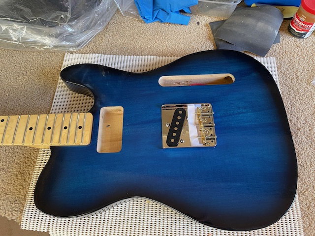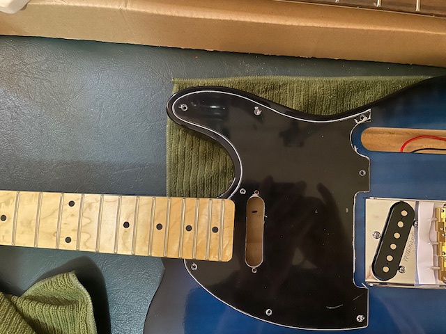 The blue tele has now been assembled, and rough tuned to allow the neck to settle.