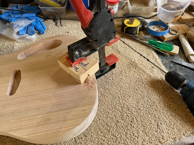 Routed the neck pocket, pup cavity and control cavity. This one is not having the normal tele control plate - but more like the thinline pickguard and controls. Also drilled the jack socket recess, the channels between the cavities, and the channel for the bridge ground. Finally, routed a quarter round edge to the top and bottom and a bit of sanding to 240 g.