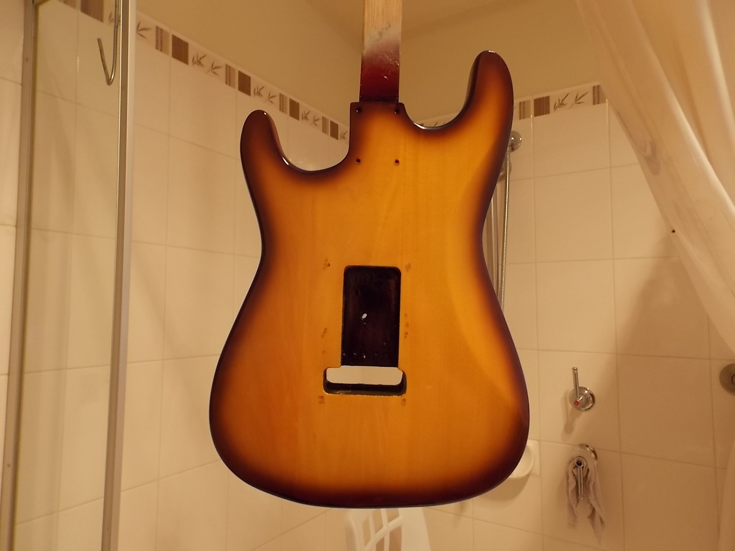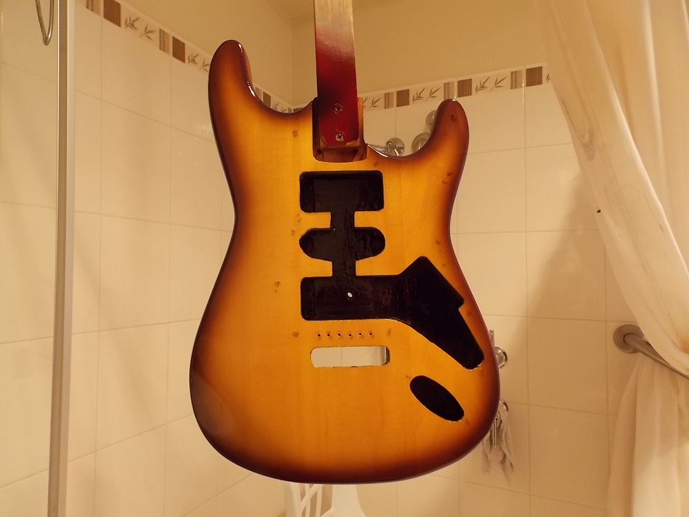 Hey guys been doing a bit of work on my st1 i done this as a test what i have done is did the yellow dye and i used a Old Baltic stain then a lacquer over it, I wanted to know how well the stain would go as a burst and how it would go as done with spray and if i had any reactions with the clear lacquer. after a few different try's i wanted a better spray friendlier and that didn't soak in to the yellow, 1st off the stain has no body to it and soaked in to the wood so what i did was thin the stain using the 50ml bottle of Old Baltic with 50ml of gp thinners then i mixed up 50ml of clear lacquer then i added it to the stain mix which gave it more like a paint that didn't soak in to the yellow dye or the wood then it was really easy to get the burst that i was after, I didn't want super dark and transparent then 8 coats of Clear lacquer over the top here a couple of pics it came out better than i was expecting and opens up a few different colour combo's, i haft to polish it in a couple of days but pretty pleased with it.
