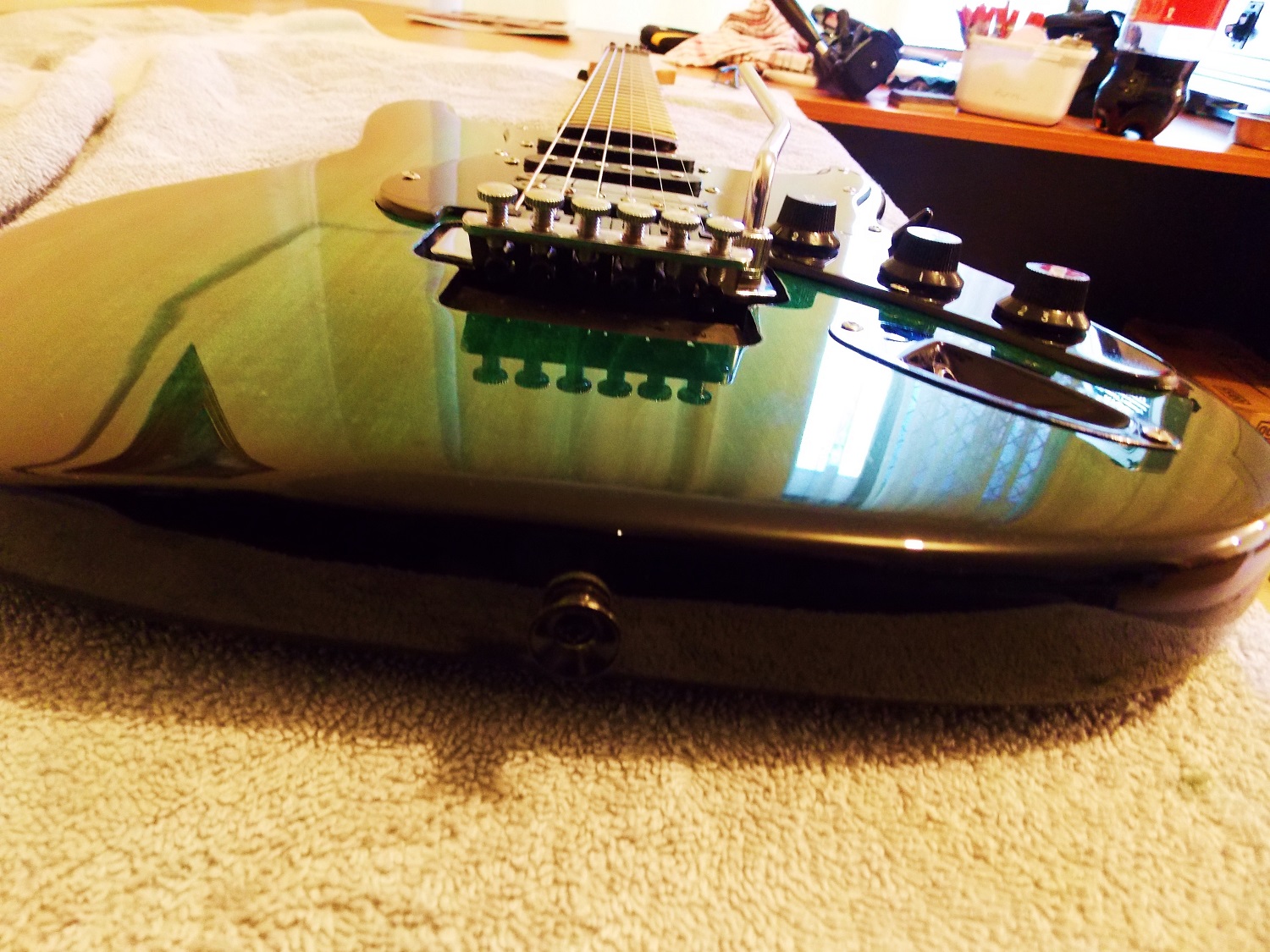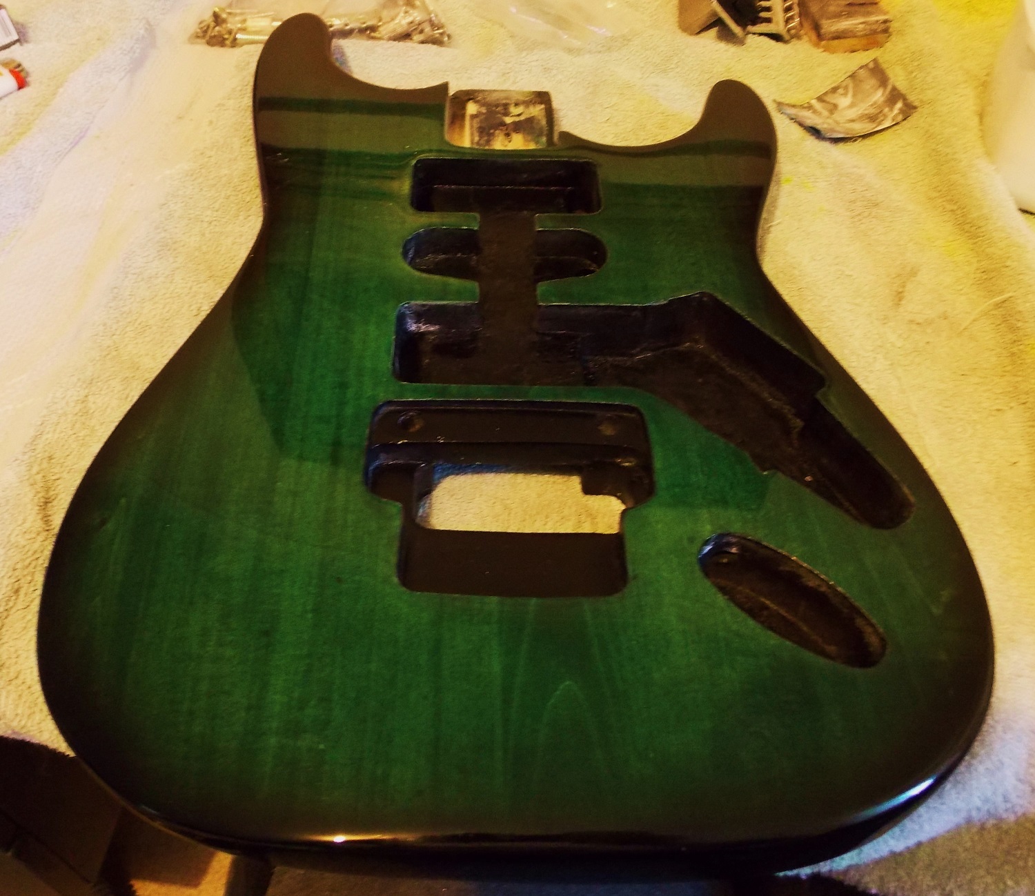 here we go still the rit dye kelly green 3 coats with a mix of clear and black to tone down the harshness or the black for the burst, 8 coats of clear lacquer the pick guard i made out of alloy as cant buy them for the floyd rose and painted black couple coats of clear and did away with the neck plate