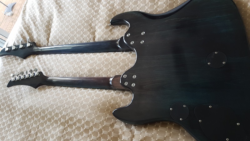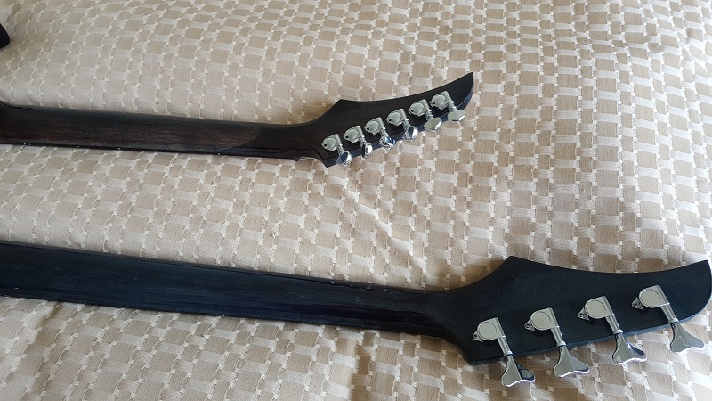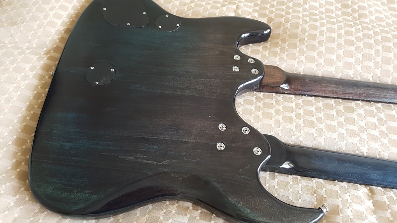 Necks are coloured with the same stain pattern as the body...blue and then the black wash. The difference between the two is stark...the guitar neck is nearly purple.