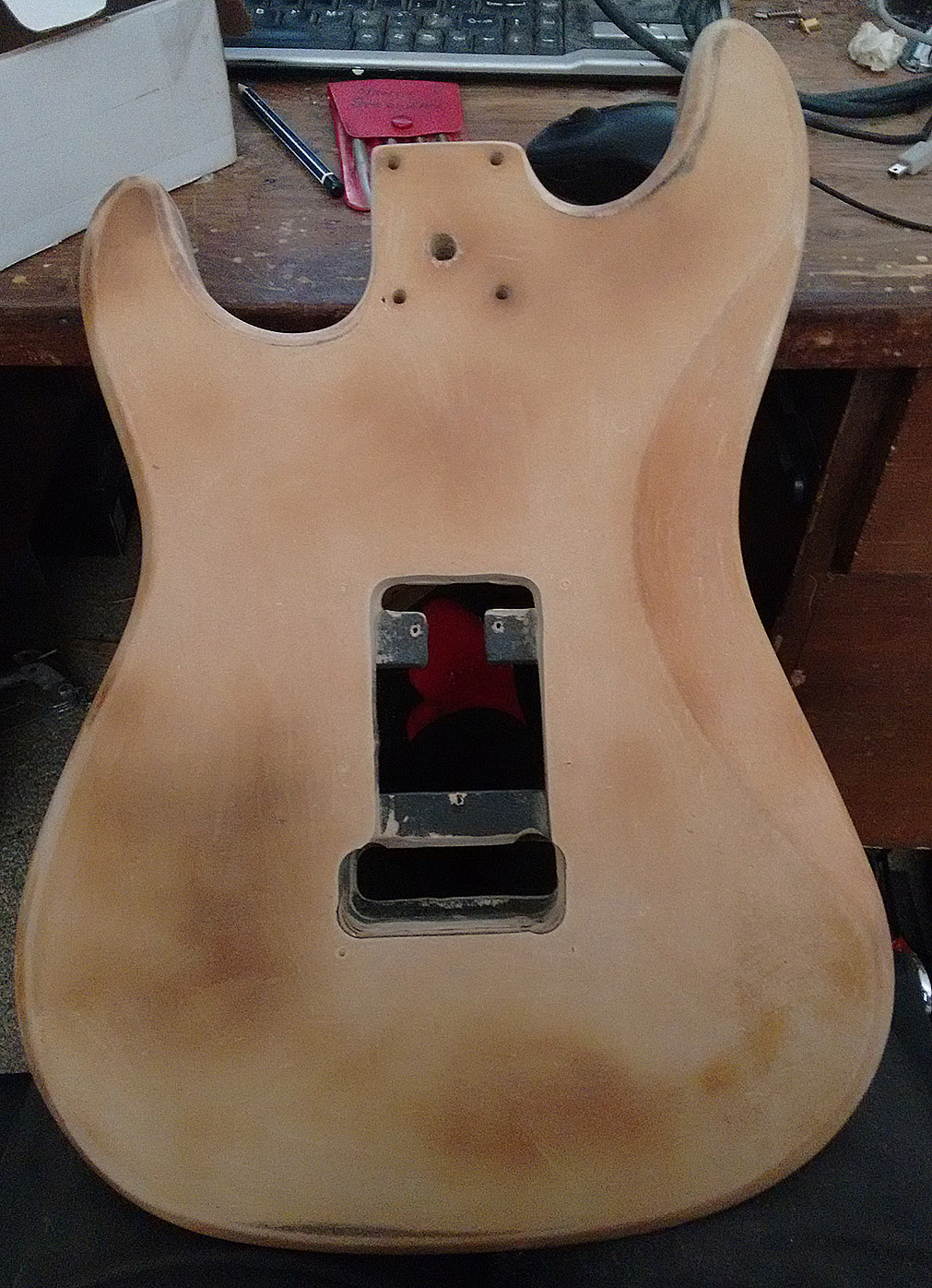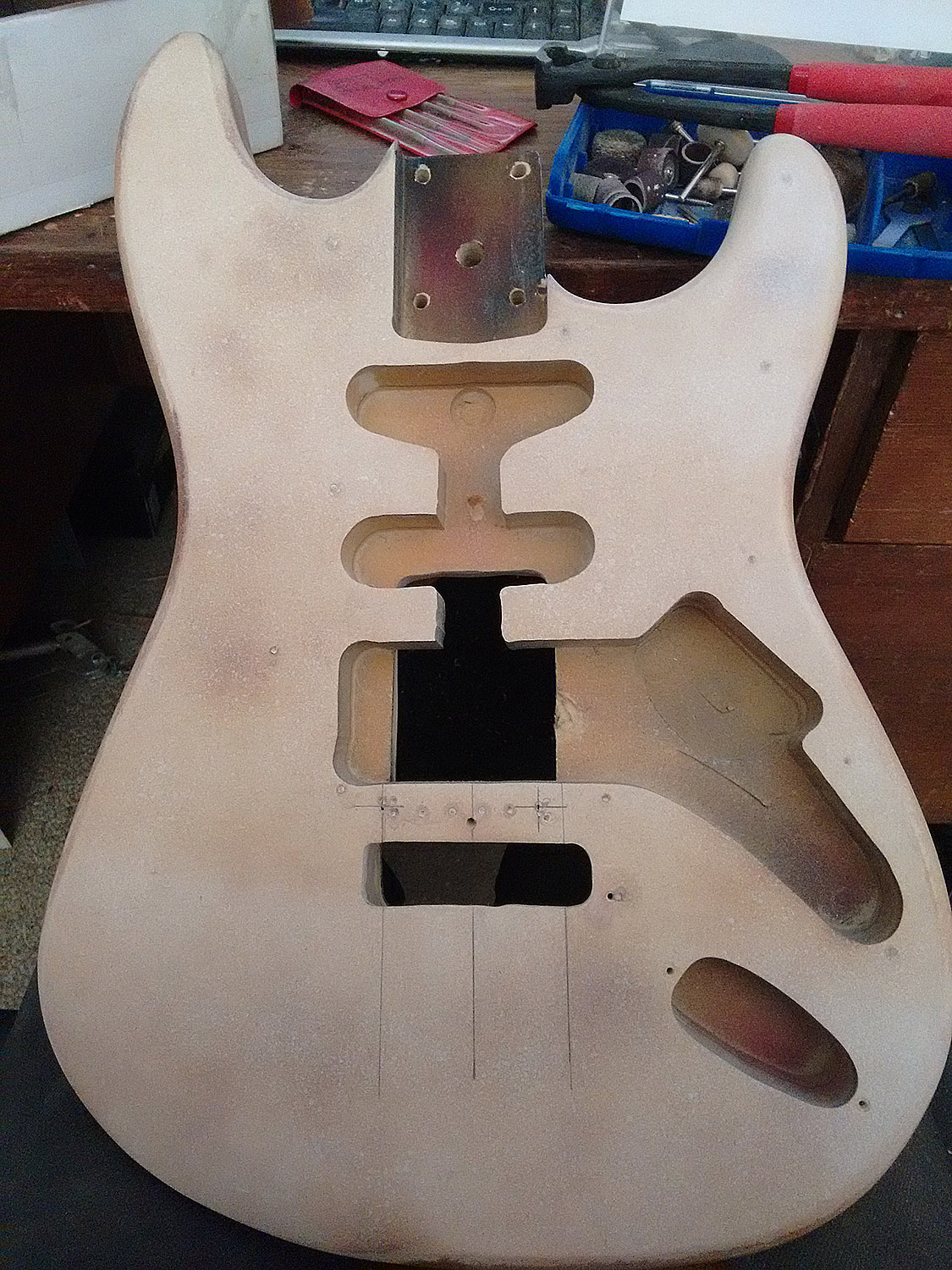 Removing the paint reveals that the body is 2 pieces of MDF sandwiched together.