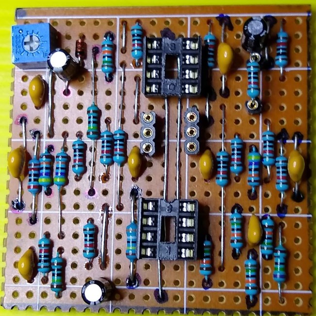 Good run tonight watching B5. Board done apart from socketing the JFETs and op amps. I am still waiting to see if the 2N5952s and TL072s arrive in the post, or if I have to substitute J201 FETS and 4558D op amps. At top-right there is a socketed resistor. There is a mod that adjusts the value of this resistor to create an intensity control. I have socketed the stock value, and once the circuit is working I can try other values or wire in a pot if I like the effect.
