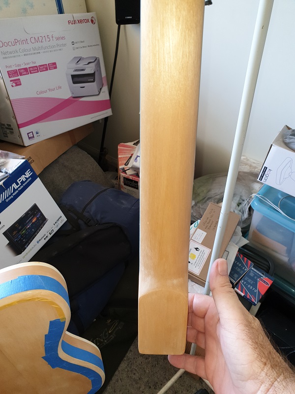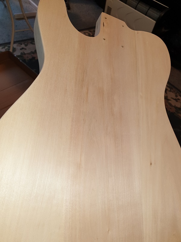 I have sanded through the grades, cedar/blackwood flavoured () timbermate on both the neck and body. Sanded to 240grit and then two light coats of the shellac I made....following somebody else's thread and tried a different ratio. The shellac has given everything a nice honey/amber hue.