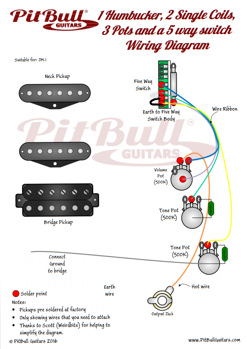 The standard JM-1 wiring diagram shows the switch linked for a common bridge and middle pickup tone control, with the neck on its own tone pot. This is a carry-over from a standard Strat modification. A standard Strat has no tone control for the bridge pickup, so using the mid tone control for both middle and bridge pickup allows you to knock some treble off the often quite strident bridge pickup on a Strat.