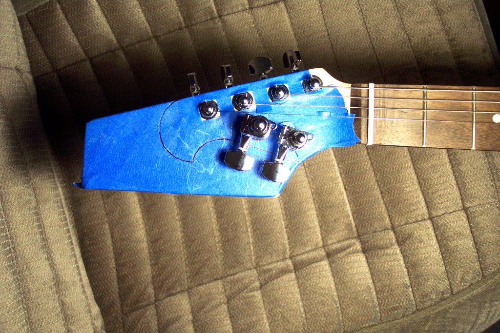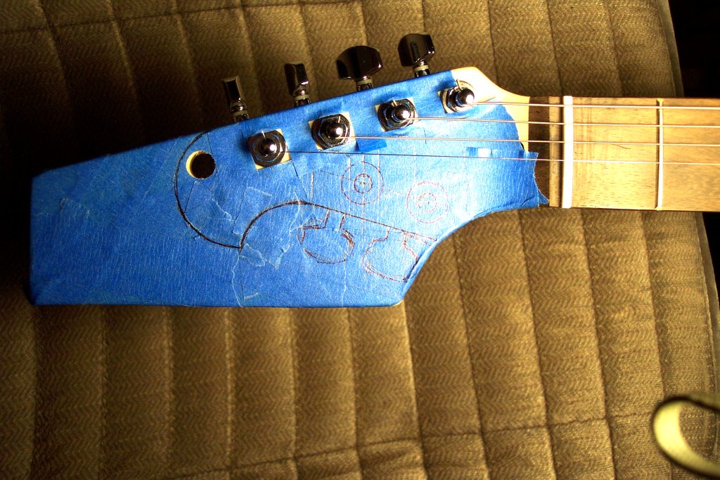 I may make a perfect plug or even drill that 5th hole larger and make a plug, from the same material I am going to cut away from the headstock. But I also think maybe just some walnut or something that looks similar to the fingerboard as a plug. (if I am going to make a natural finished headstock. could also just paint it. Also could be a place to fill with the natural material right next door, then do an inlay over
