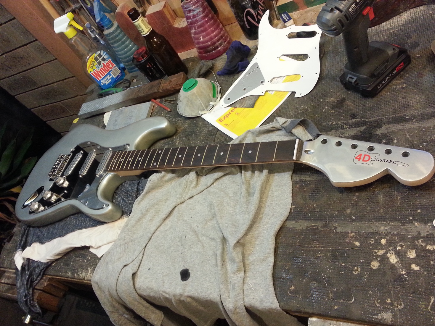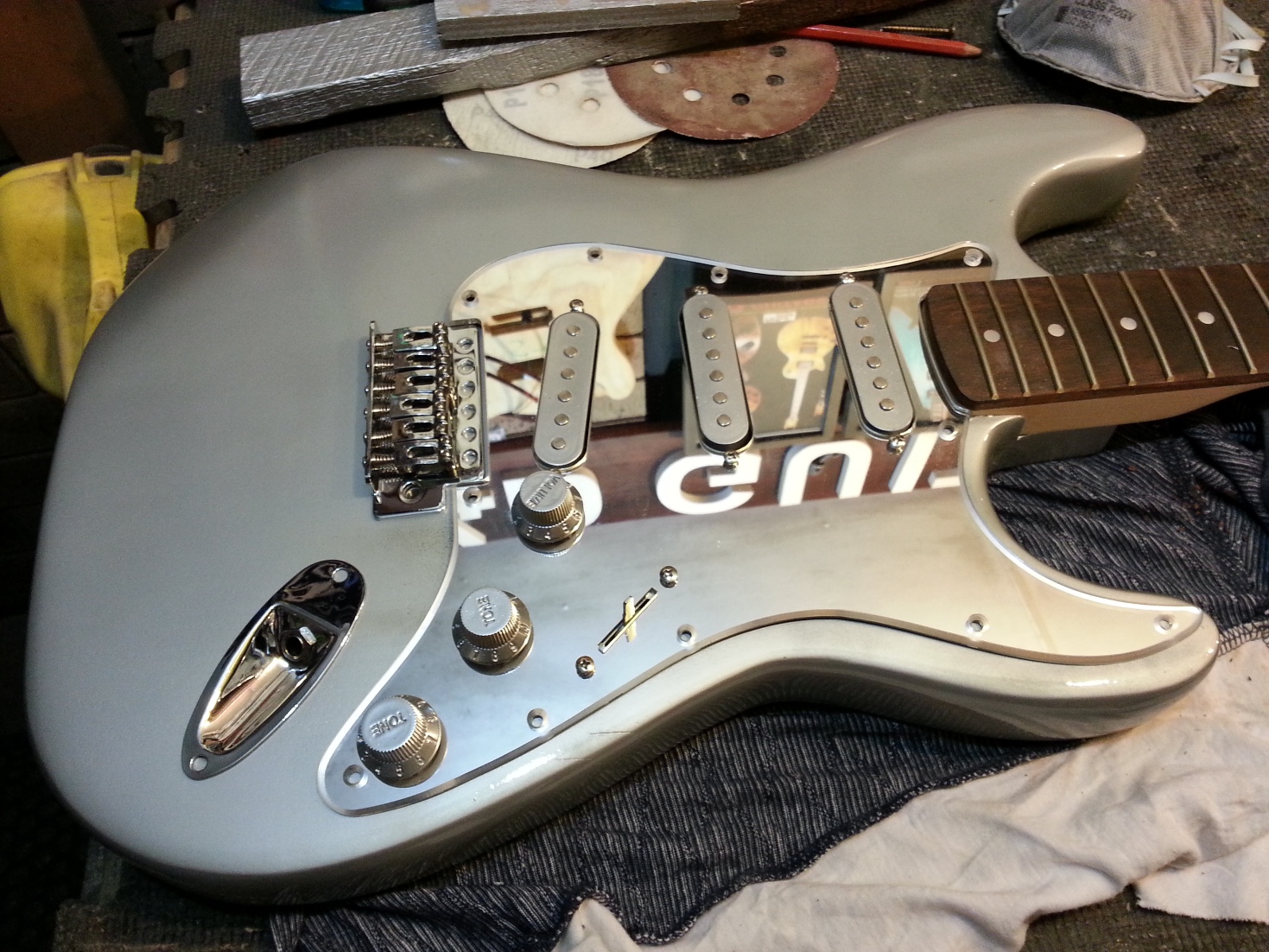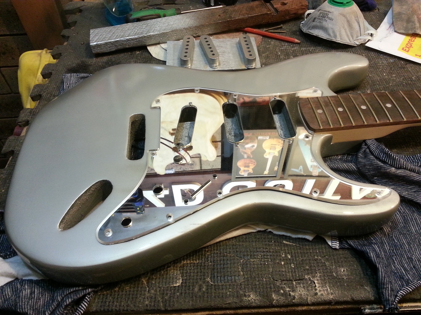 @ Max, I got a mirror pickguard made by Pablo and will use the chrome hardware. Got tonerider city limits and may upgrade switch, pots and cut a bone nut