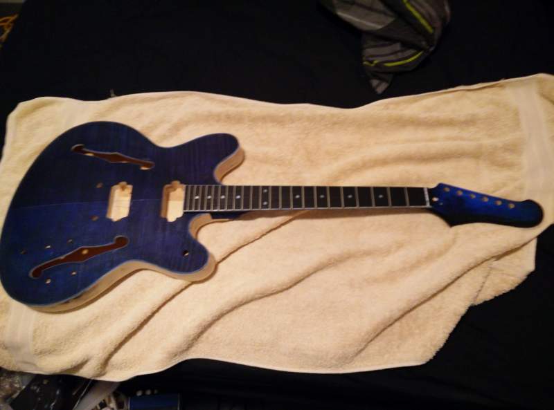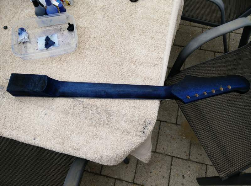 Here's the front of the guitar as it looks now and the back of the neck. I blackenned the fretboard and stained the headstock. I will need to darken the front headstock if I can't lighten the body.