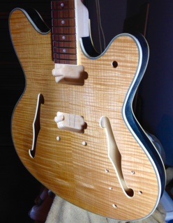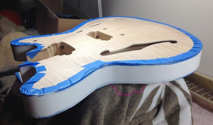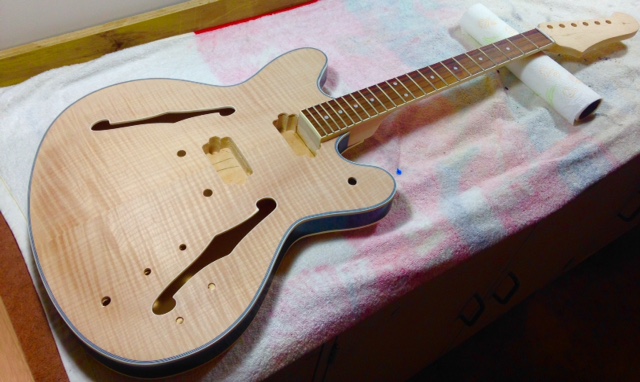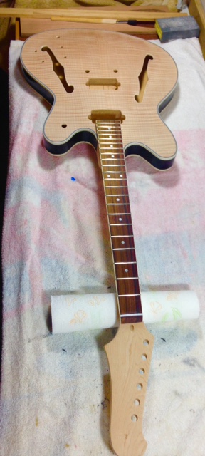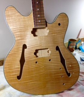 I've sanded gently for 2 weeks, and I've made a decision on finish. I am beginning by finishing the sides of the guitar with a gloss black enamel. The quality of the grain in this area is not good, and I want a visual division between the front and back, both of which will be finished naturally.