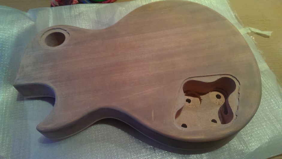 Pot holes have been enlarged, little bit of sanding around neck inset and HB routing means the air gap problem from before is no longer a thing. Got to experiment with that water / iron / steam trick for fixing small dings. It works