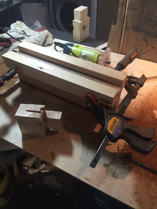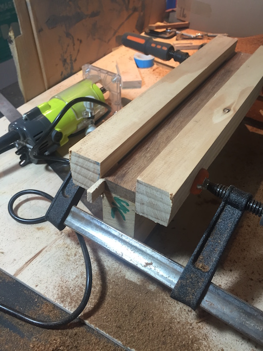 Without a band saw or table saw longer rip cuts have been challenging, so once i had the two Merbau edge bands roughed, i had to do something to make them even and square. I rigged up a routing guide, based on some of the sterling work arounds Simon had demonstrated in his scratch build.