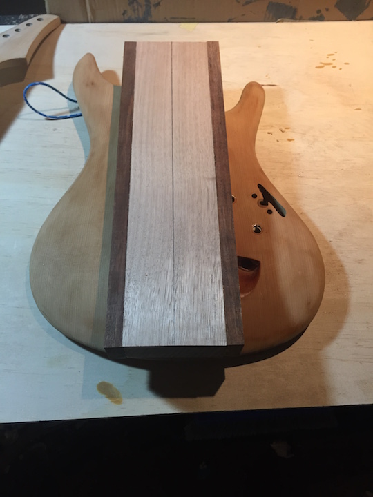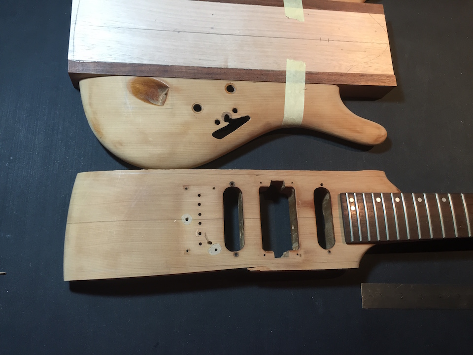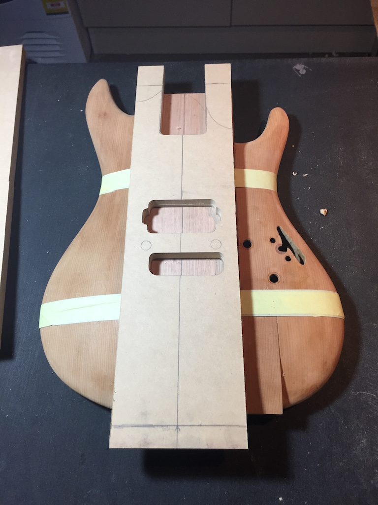 I've a plan for filling in the breakthrough but more on the later. I've begun preparing a routing template for the mid /new section of body which i intend to rout before i attach the reworked wings. There is some subtle change to the shaping of the lower horn and both cutaways which should make playing higher easier than on the original.