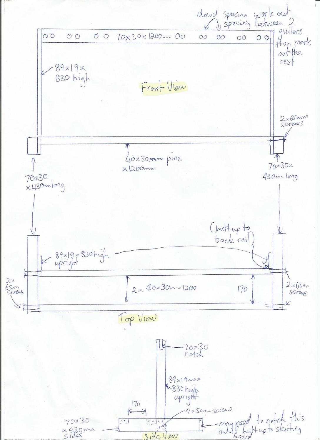 1) 2 pieces of 70 x 30 x 1200mm pine (for base sides and backboard which supports necks)