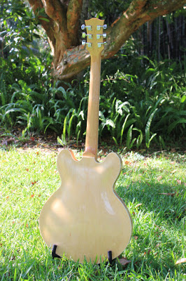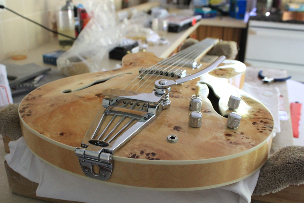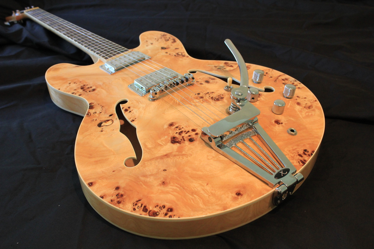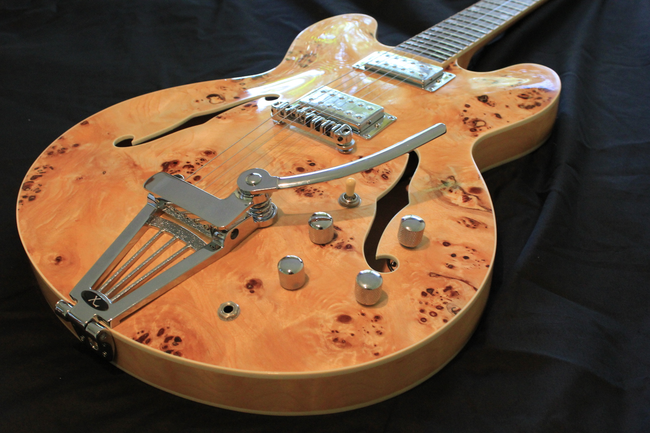 Here is my 335 from A DIY kit. It's got a burled maple veneer and sounds amazing. I have a very thin finish on it and this thing twangs like you wouldn't believe. I've got GFS pickups (Dream 180s) as well as an xTrem and roller bridge. Amazingly, with just the xTrem and roller bridge, tuning stability is really great. Anyway here she is.
