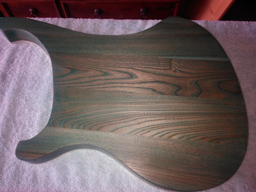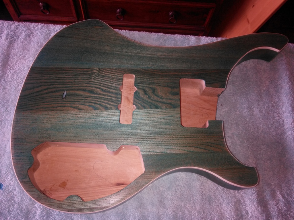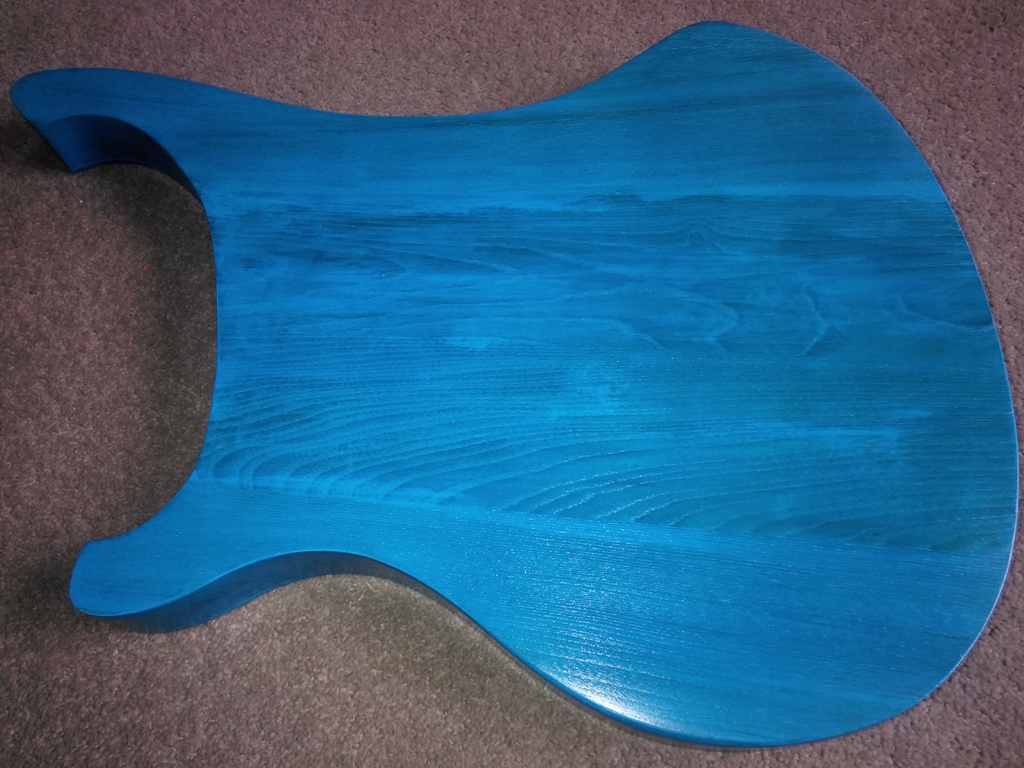 Been a bit of a delay since my last post, been busy with work, plus had a major problem with Wudtone UK, complete waste of time they are. Sold me a blue stain, which came as a 3 pack. Base coat, deep colour coat and a top coat. After I'd applied 7 coats it was still green, when I contacted them they said it was my fault as I had put the coats on upside down - the base is supposed to go on last ! ! After a bit of argy bargy managed to get my money back. After talking to an expert with finshes, who my guitar tech mate put me in touch with, he said that blue was the most difficylt colour to stain with as on Ash or any yellowish wood it would come out greenish (pity Wudtone couldn't have told me that). However he suggested putting a very dilute white paint on first and then use a tinted laquer, which would then reflect the white whilst keepig the grain. So had to sand it back down to the bare wood - what a job that was ! Did the white coat and with 3 coats of the tinted laquer we have the attached finish, just got the top laquer to do now, then ready to start assembling. So back on track eventually. Will have some questions before I glue the neck - so be back on in a few days.