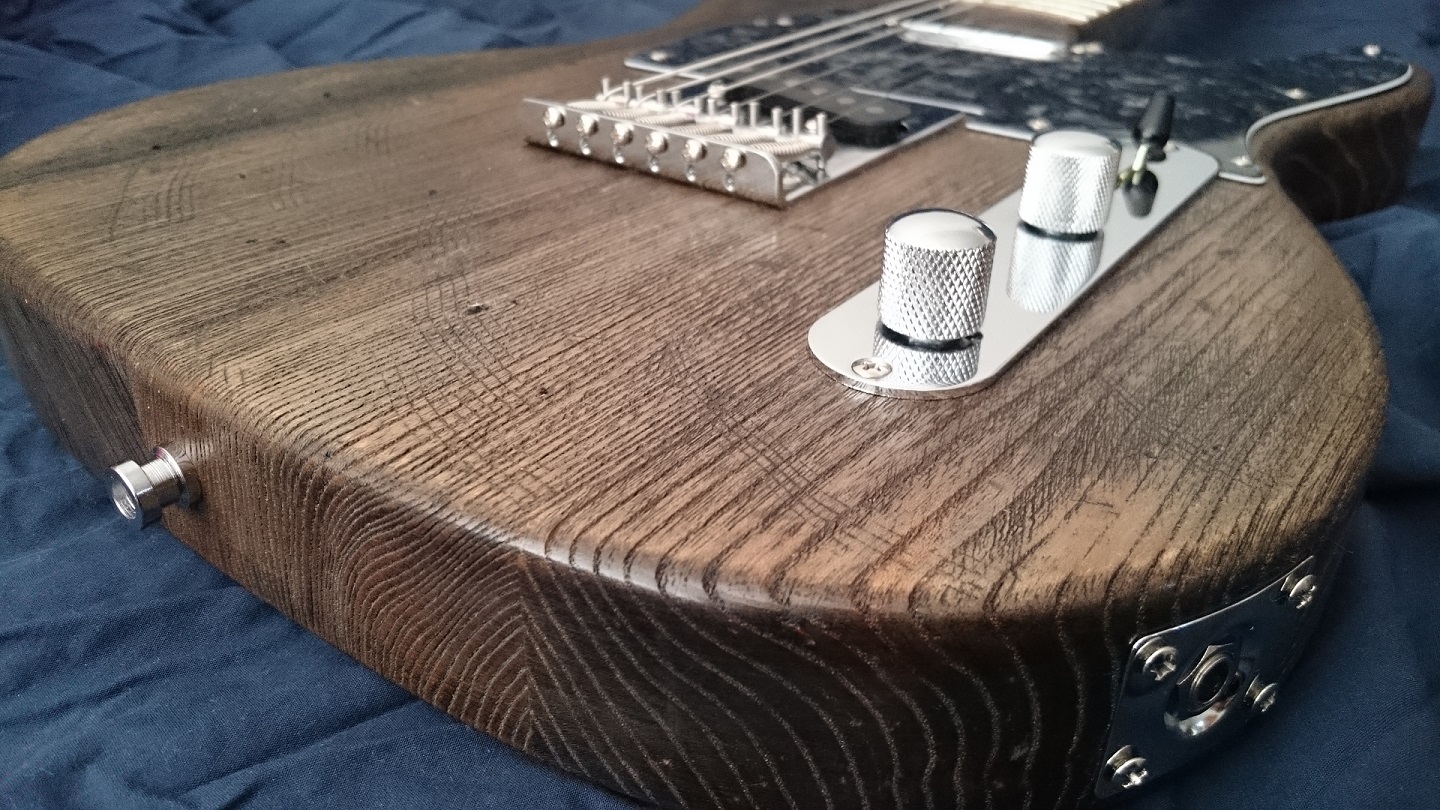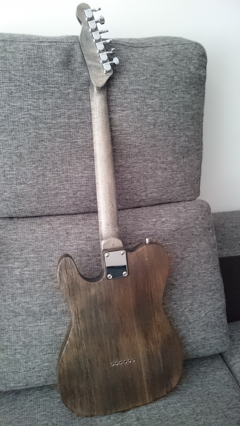 Electronics are 500k pots (yes I know - 250 would be the standard), 0,47 capasitor instead of 0,22 (yes I know...). 4-way switch to add the series effect. Found out a story about using a 0,47 in a Tele would do something amazing so I tried. Conducting aluminium tape to the pup and control cavities.