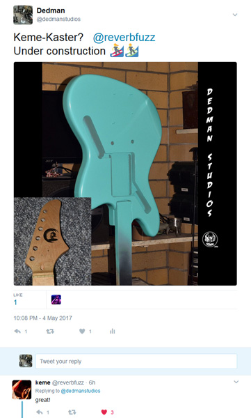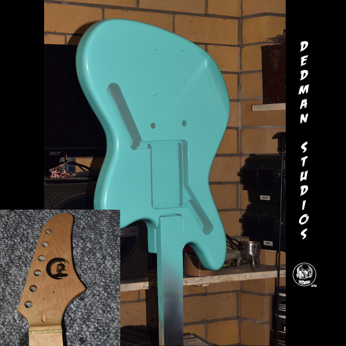 first colour coat is on, new headstock logo is on. (it's a caricature of Keme from Tokyo Killer/Kinoko Hotel/Piggy Banks who's wailing on JM's is what set my mind on a JM)