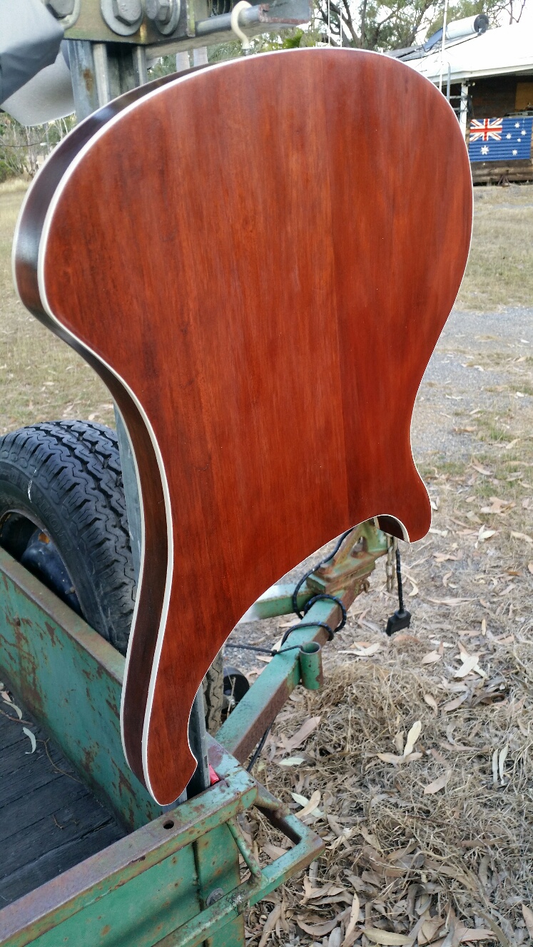 With me mentally booting myself from here to the Black Stump and back, and cussing under my breath all those Canadian and American YouTube videos on how great and easy Minwax wipe on Poly is and all of them without the warning that with thin coats in the tropics (above 25C) it dries in near on 60 seconds, a third rag was use to finish off the Mahogany body in Poly...
