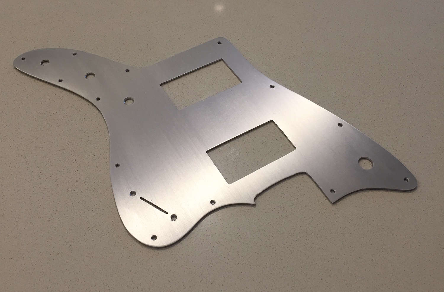 Feeling pretty chuffed with my efforts today! While waiting for the replacement kit I've worked on a potential pickguard. As per the previous post about it, I cut the rough shape with a jigsaw from a 1.6mm aluminium sheet. Today involved a heap of drilling, sanding and filing, before using a green scotchbrite to buff it. The hardest part was the slot for the switch - I used a dremel cutting wheel to get through, then little files to open it up. There's still a fair bit of clean up work required especially the neck pocket at waiting for the neck to match that up right. Also some work with the pickup holes - including drilling for the pickup rings I'll be using - but I'll wait to do a mock build to get eberything lined up. That said, very happy with the results at this point.